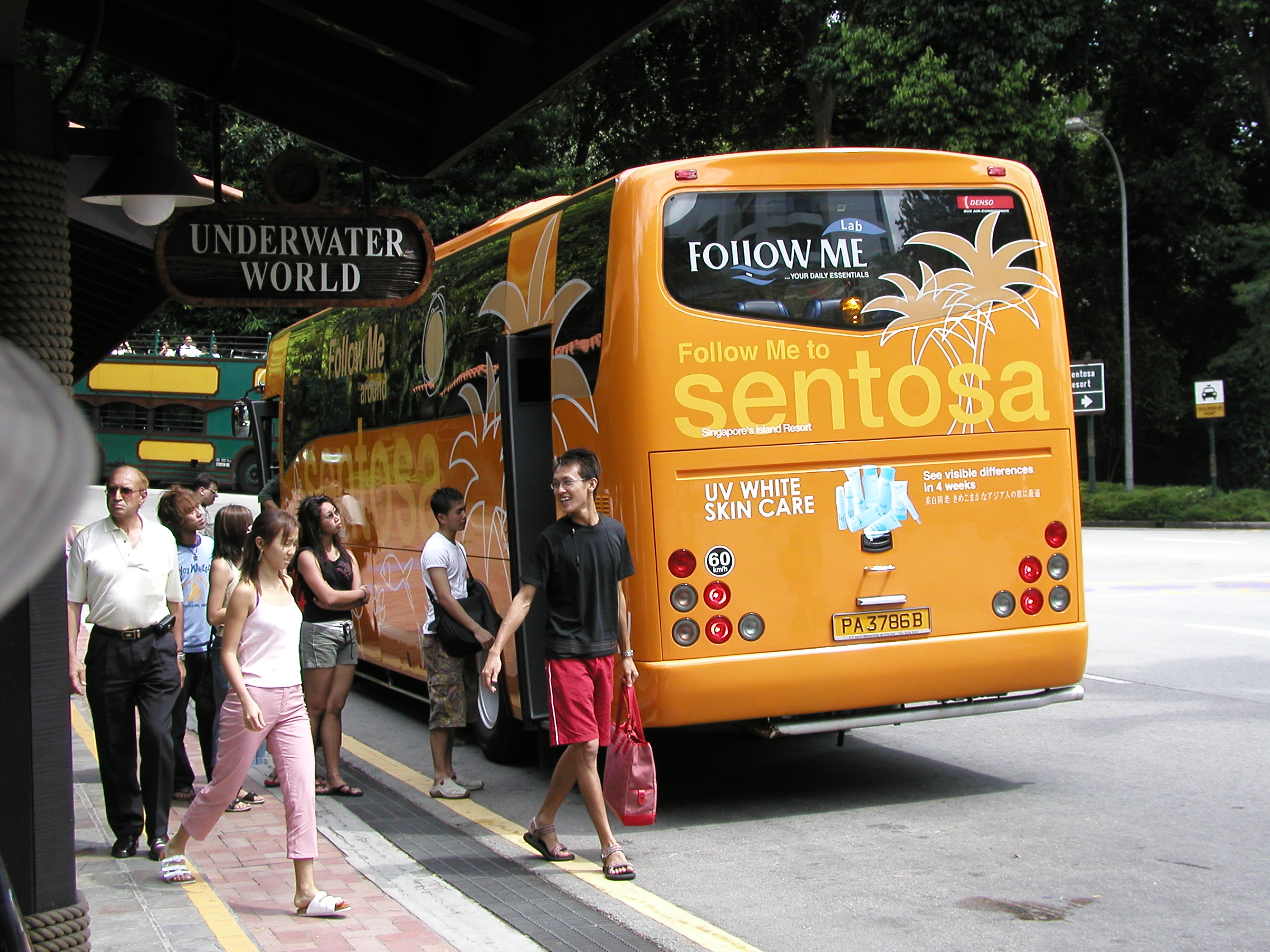 MRTティオン・バル駅前よりセントーサ行きの専用バスが出ています。1時間に数本発着しておりほとんど待たずに乗れます。横には大きく「SENTOSA」と書いてありますので、すぐ分かります。これはセントーサ島へは橋を渡って入ります。