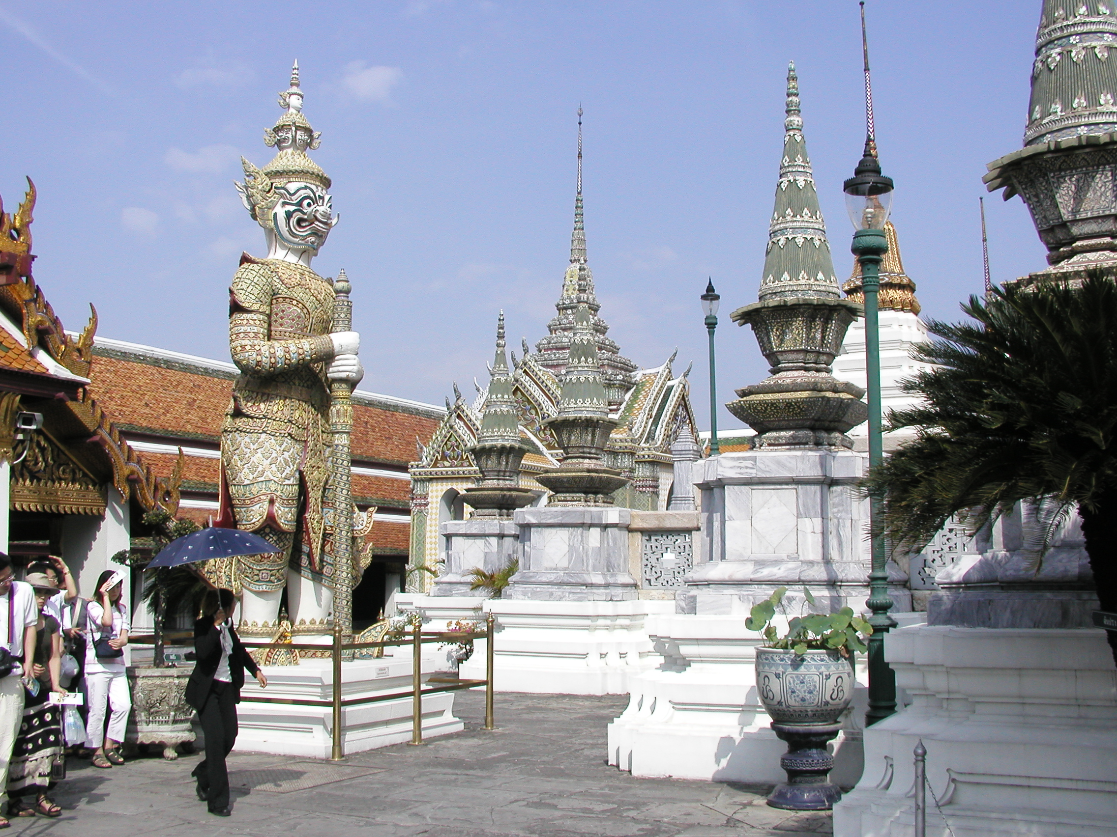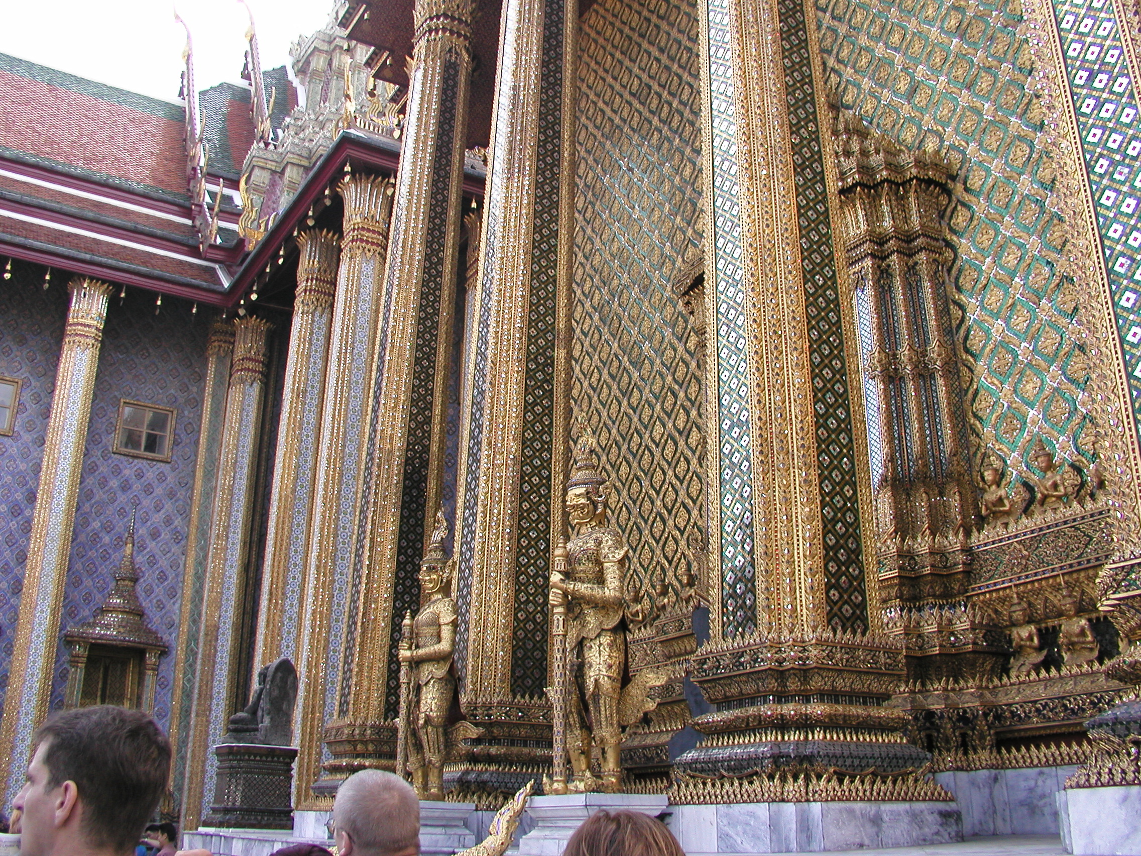塀の中に入ると流石は王宮、大変な人ごみです。 建物は多くが金箔や綺麗な陶磁片で覆われており、キラキラ光ってとても綺麗でした。また、いかにもタイらしい魔人の像もあったりしました。このあたりではもう皆で写真とりまくりです。