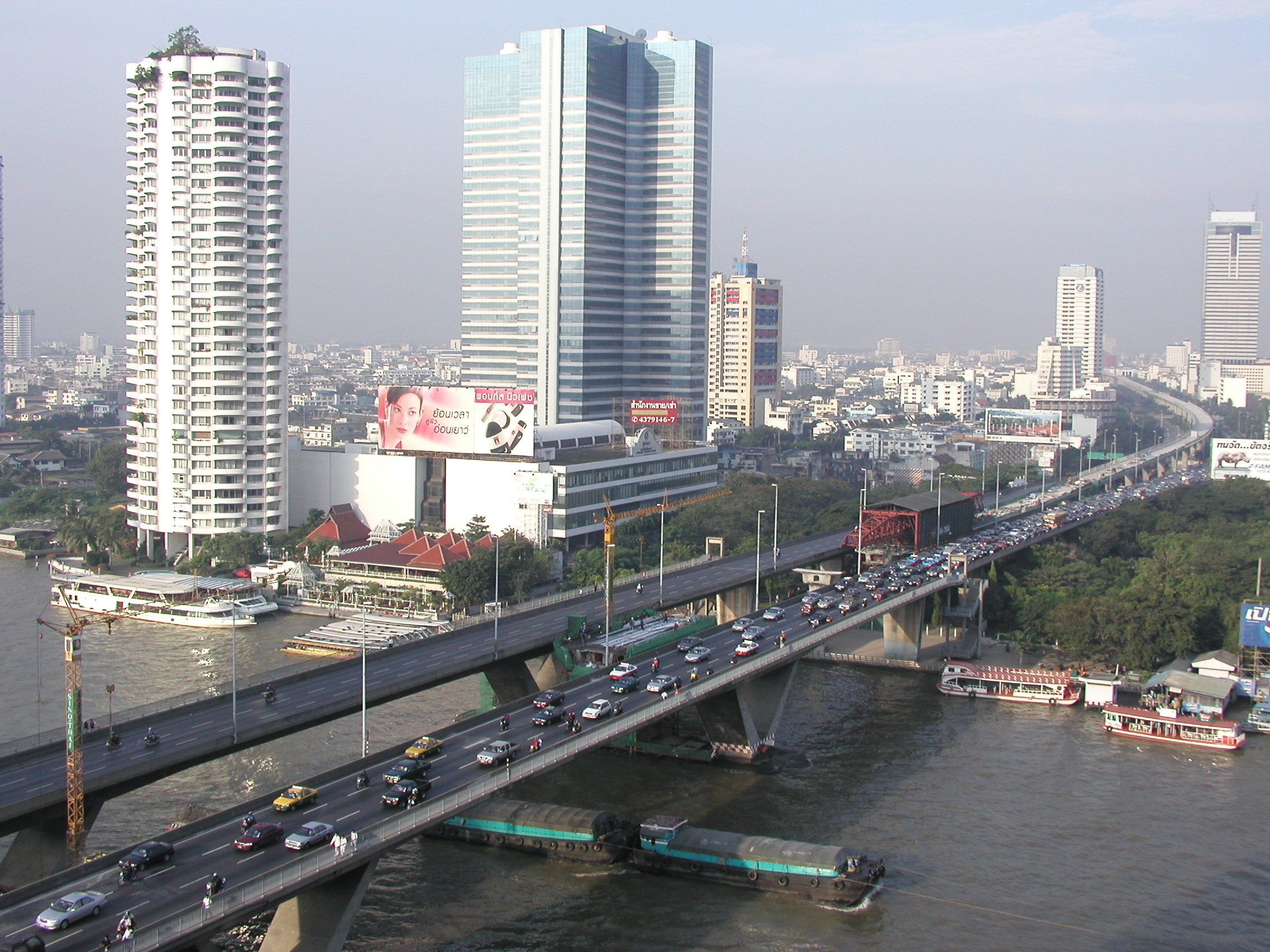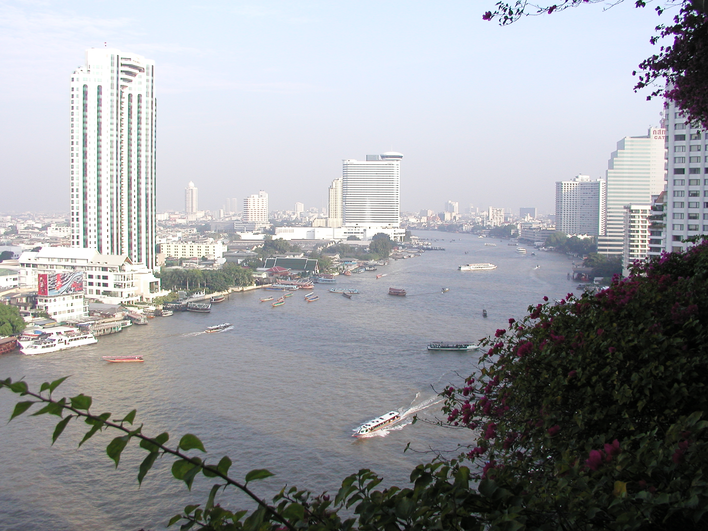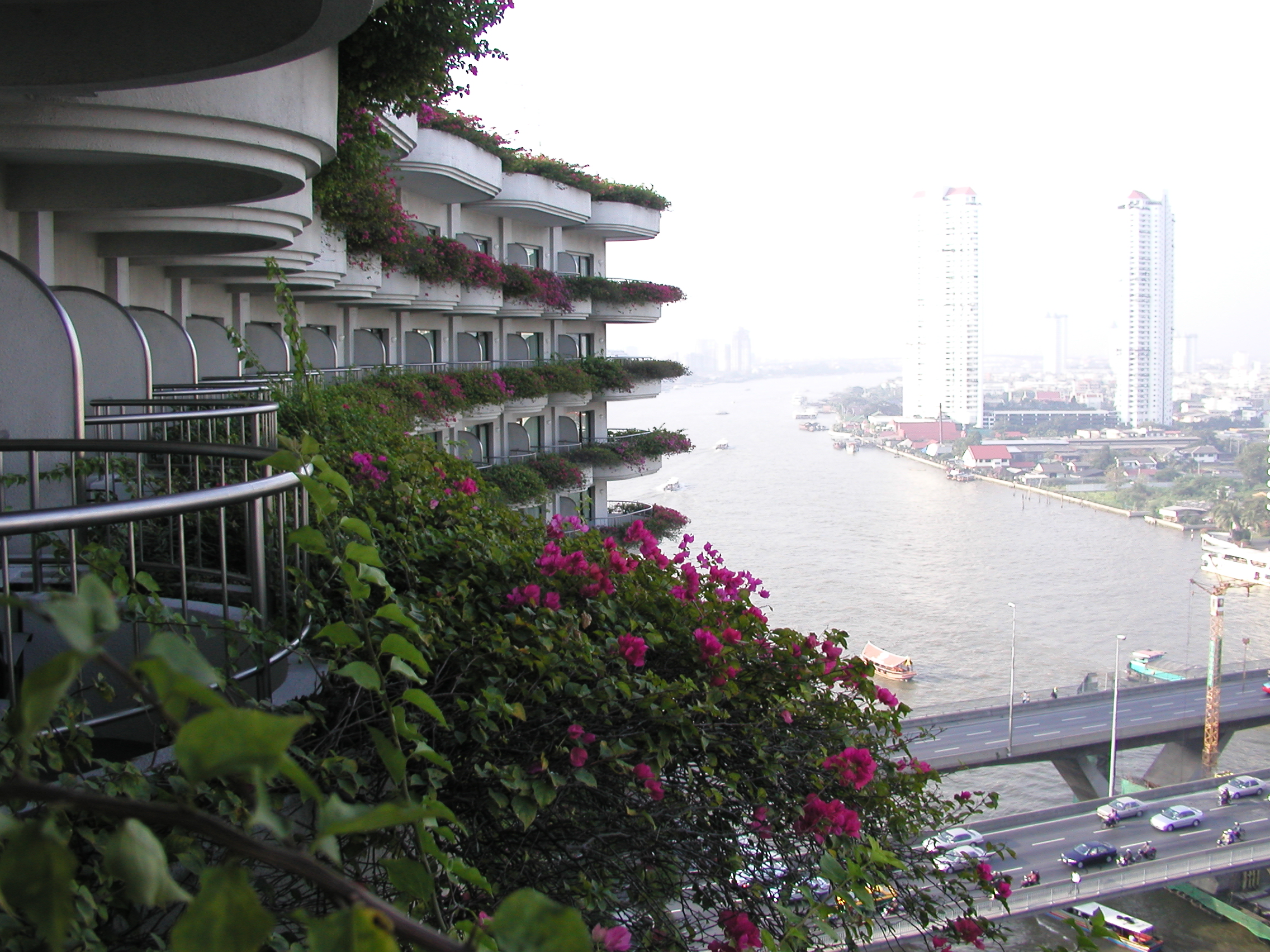 まだ明るいのでホテルの部屋のベランダで一服しながらくつろぎます。このベランダからはチャオプラヤ川を真下に見下ろすことが出来、景色は最高です。船がたくさんいます。しかし残念ながらすぐ下の大通りの橋がかかっており、そこを走る車やバイクの騒音が結構響いてきました。これさえなければ眺めは最高で文句ありません。