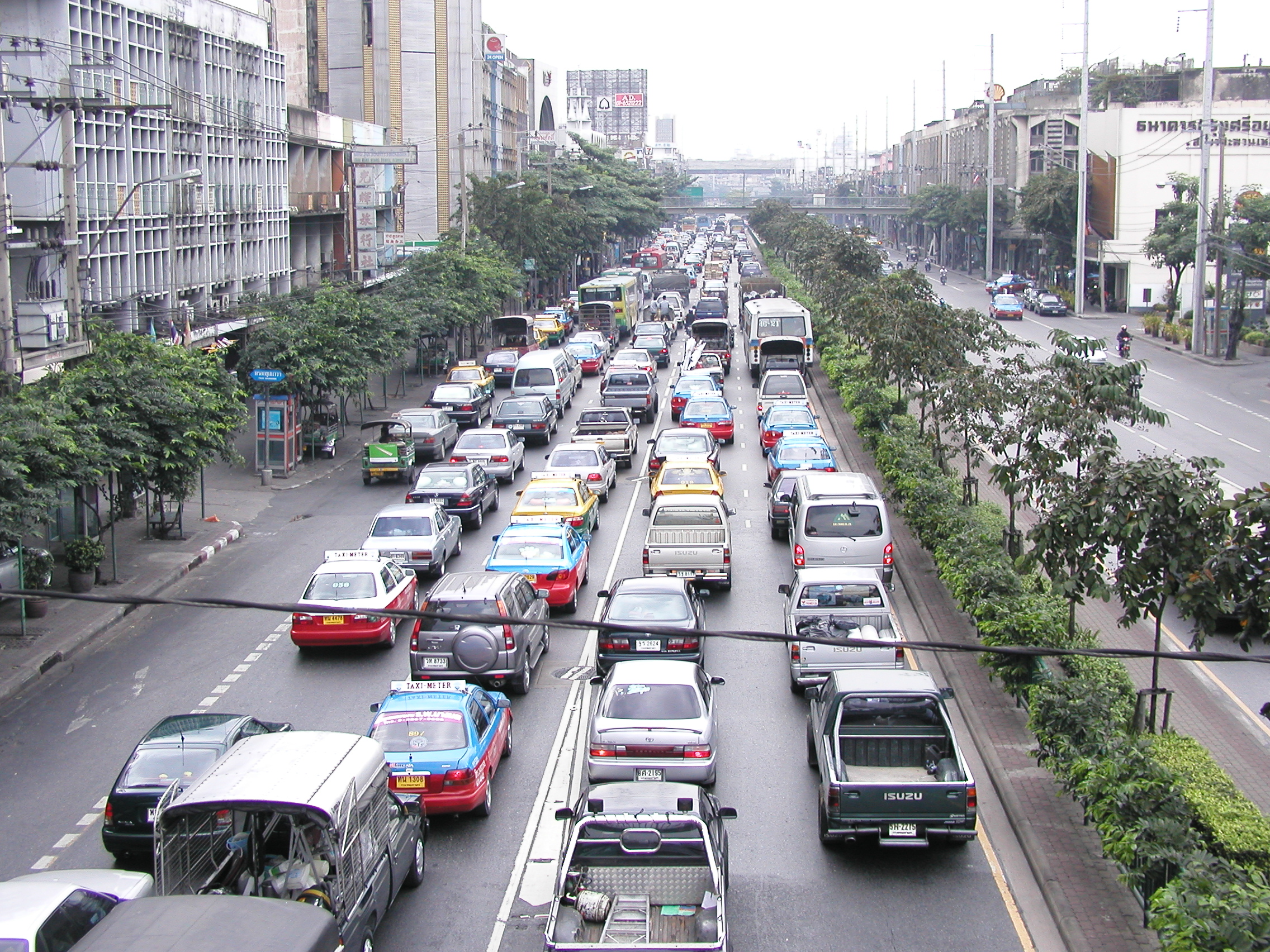 まずは水上マーケットに行くということで船乗り場に向かいますが、ウワサに聞いていた通りバンコクの渋滞はものすごいものがありました。通勤時間帯ということもあるのでしょうが、車やバイクがうじゃうじゃいて道路はどこもかしこも大混雑。しかもマナーも良くなく平気で割り込んでくるし、バイクは車の間を縫ってたくさん走っています。そのバイク、こちらは3人、4人乗っているのも目立ちます。ひどいのはお父さんが子供を抱っこして運転し、後ろにお母さんがやはり子供を抱っこしている、という4人乗り。ヘルメットもかぶらずに乗っているので見ていて危なくて仕方ありません。