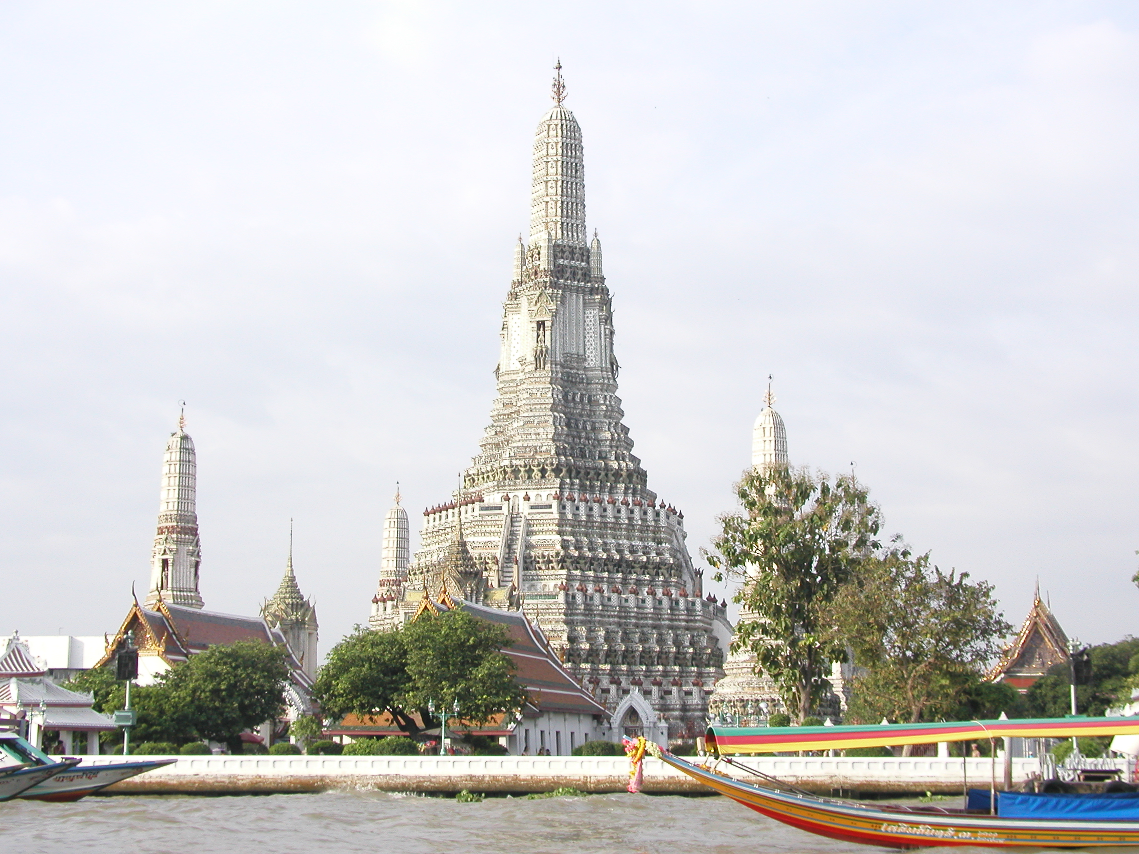 次はバスに乗り込んで寺院見学です。まずは暁の寺(ワット・アルン)に向かいます。この寺院は川沿いに建てられており船からも見ることが出来ます。真ん中に高くそびえ立つ大きな塔が目印です。この寺院は三島由紀夫の小説「暁の寺」の舞台にもなっています。