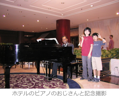 ホテルに戻り酔い覚ましにロビーで休憩します。グランドピアノを弾いている優しそうなおじさんの演奏を近くで聞きながら4人でジュースを飲みます。流石にホテルで演奏しているだけあって、非常に上手な演奏でした。このおじさん、愛嬌がよくてリクエストはないか、と聞いてくるので、子供たちがクリスマスソングやタイタニックのテーマをリクエストしていました。