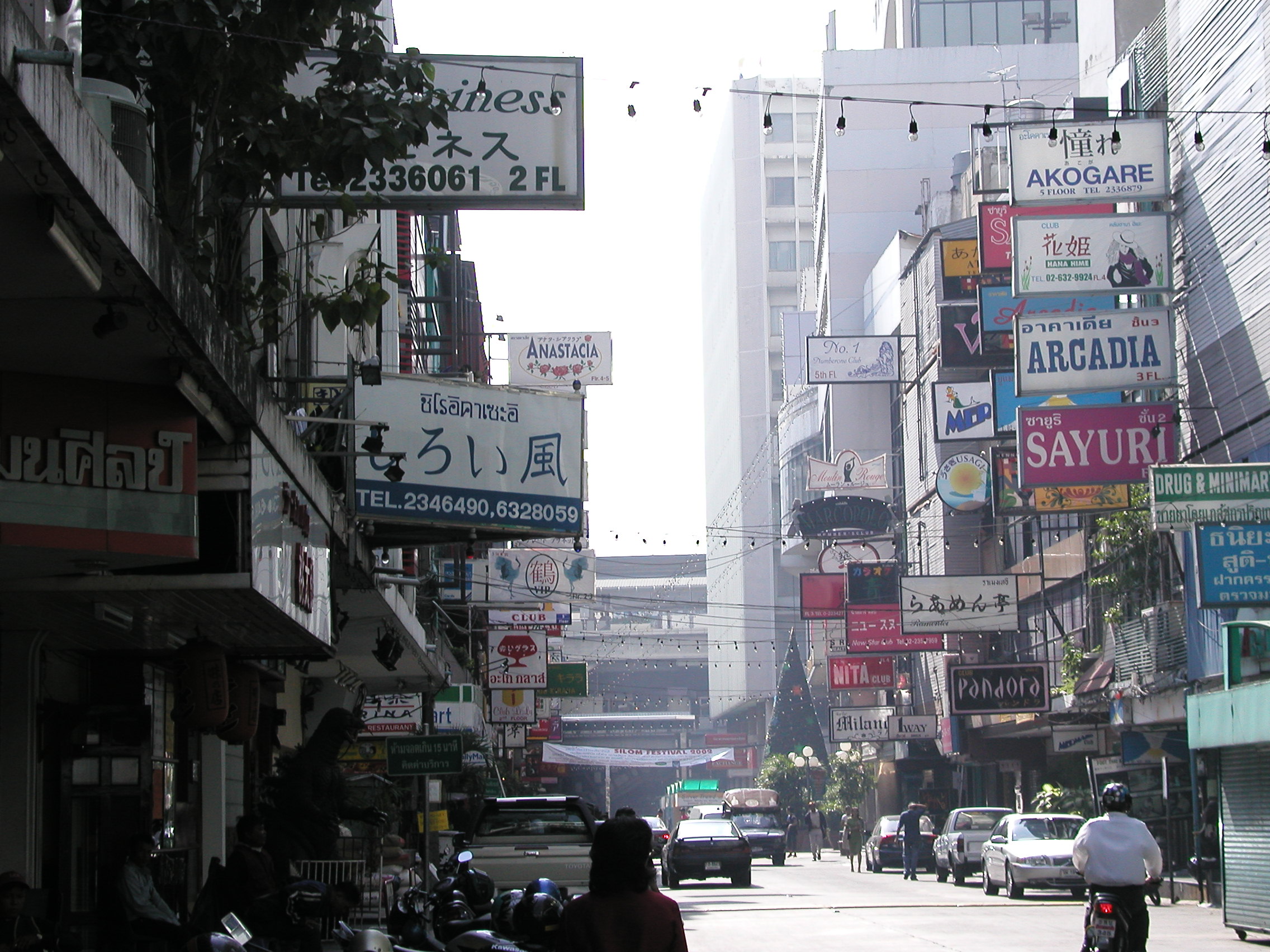 駅を降りてびっくり! 駅前通りの両側は日本語の看板がたくさんあります。タニヤ・プラザとかお寿司屋さん、はてはバーなどの飲み屋さんまで非常に多くの日本語看板が乱立しています。ここはきっと日本人向けの歓楽街なのでしょう。バンコクの駐在員が多く来ている所かな、と思いながら歩いていきます。
