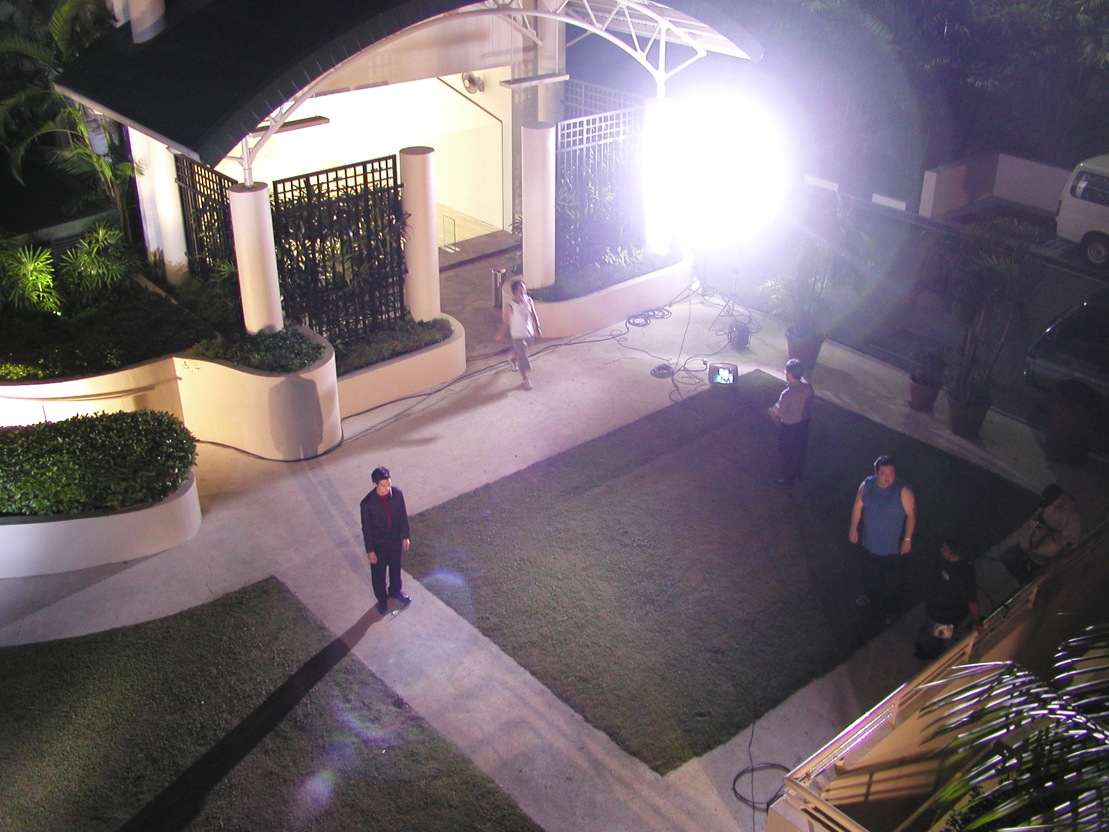 良く見ると人が立っていて証明で照らされており、付近にはテレビカメラがあり撮影していました! そうです、何と我がコンドミニアムでテレビ撮影をしているのです。これにはびっくり。すぐ家族を呼んで3階の部屋の窓から撮影光景を見ていました。
