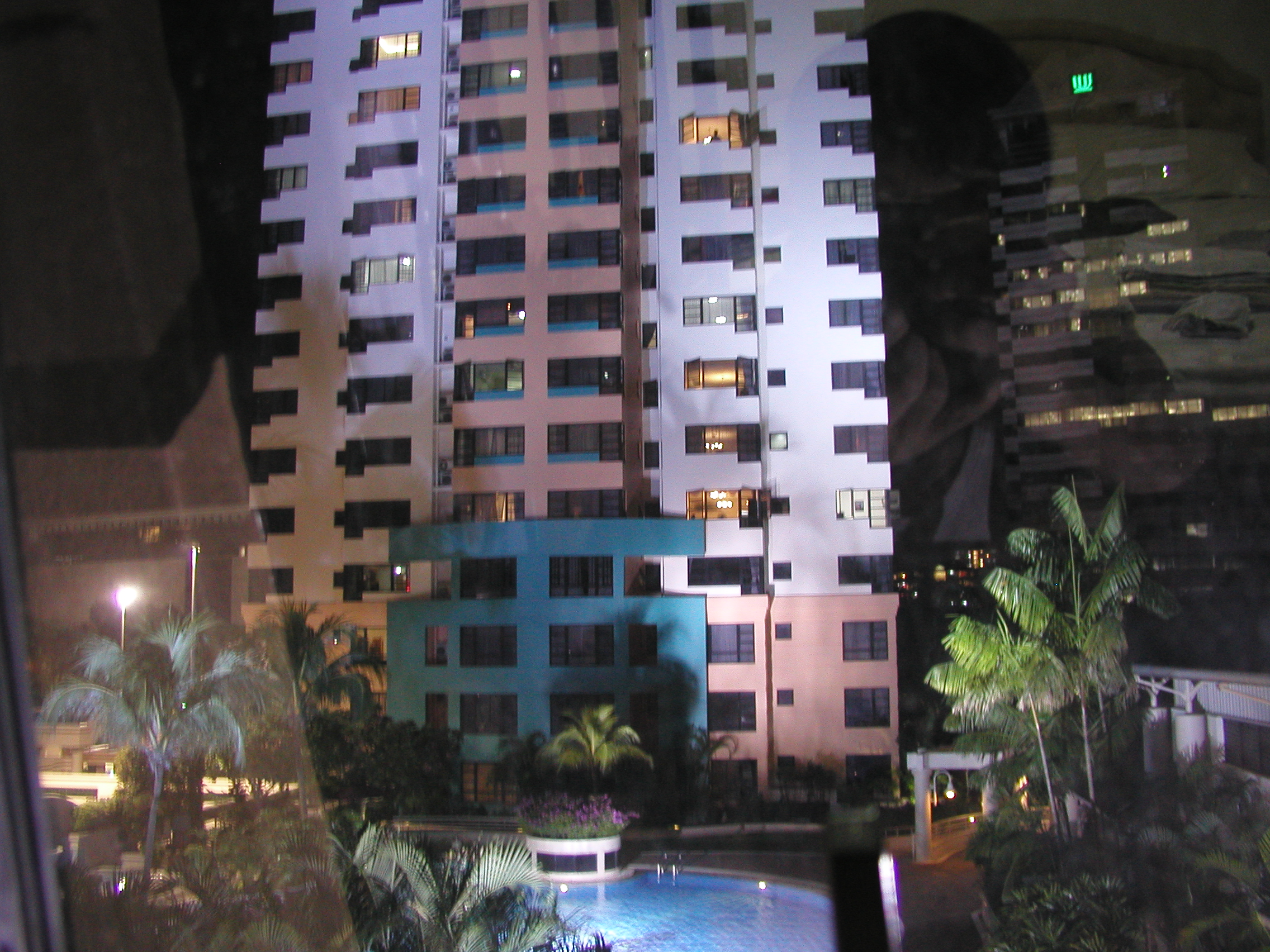 ふと窓の外を見るとプールの向こうの向かい側の建物が明るくライトアップされています。最初は何かの工事かと思いましたが良く見ると窓の下がざわめいています。