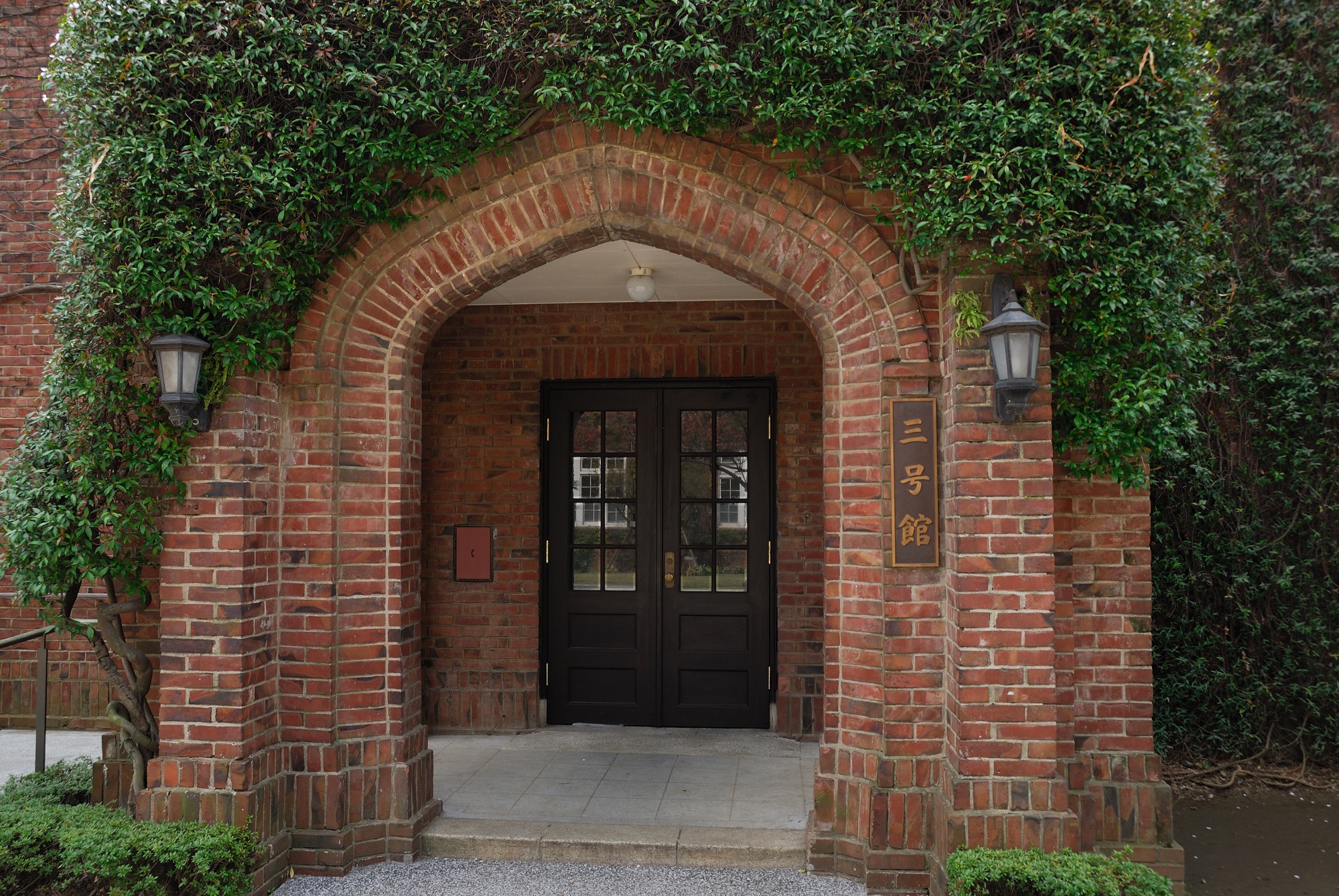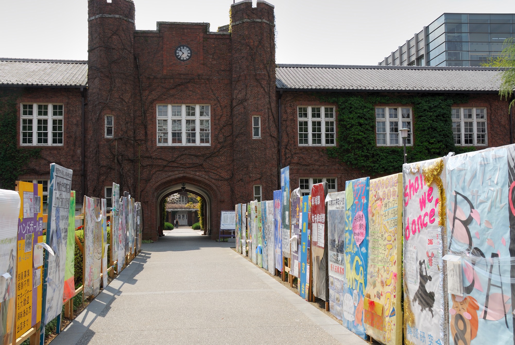 そのチャペルを抜けると,そこには1918年に建造された本館(モリス館)があります。その正面が正門になっており,その通路には新学期だからでしょうか,新入生向けの部活への勧誘パネルが多く立ち並んでいました。