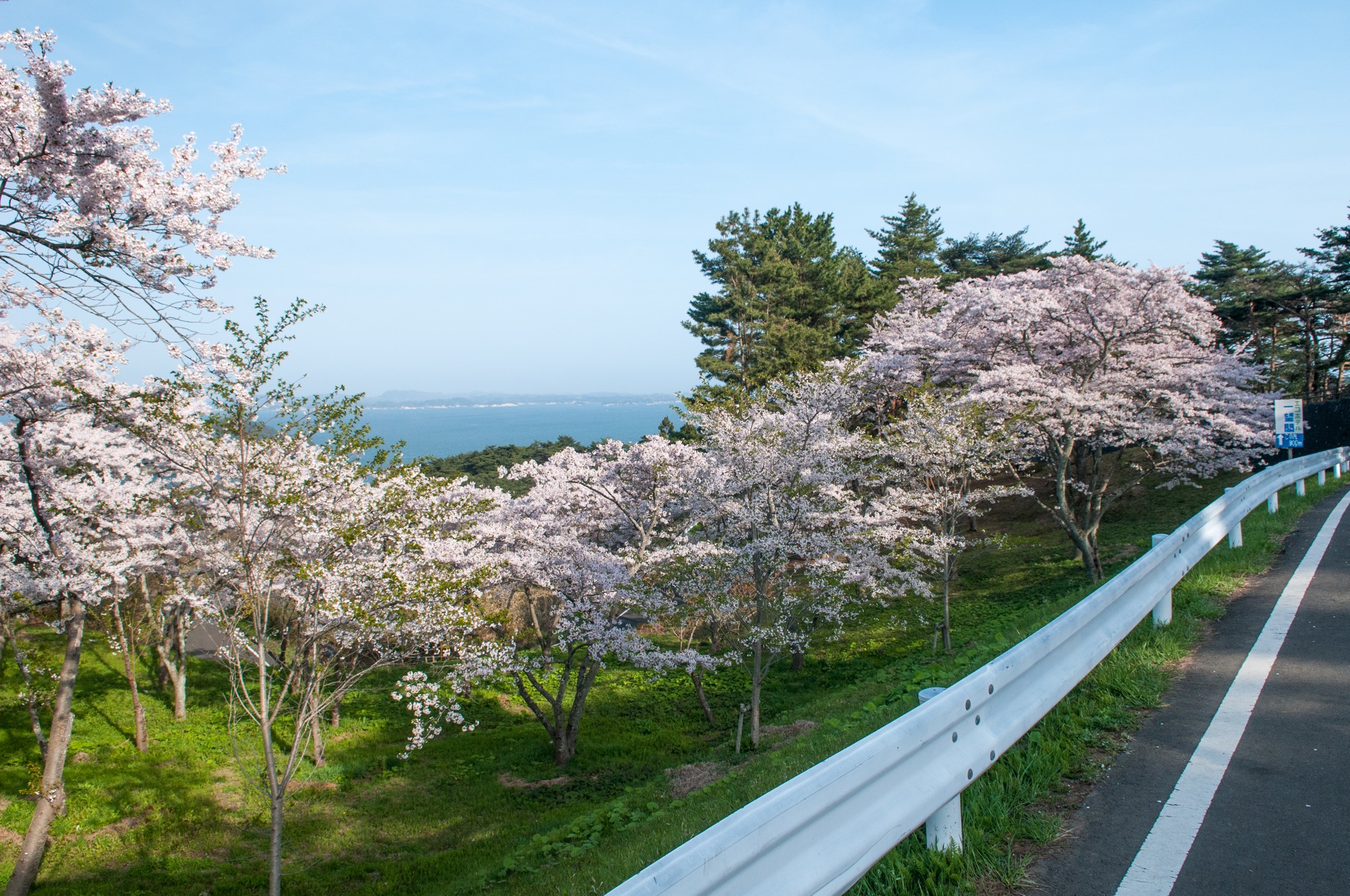 進みながら前方を見ると、桜が多く咲いておりその先には松島湾が見えてきました。もうこのあたりでワクワク感で一杯です!