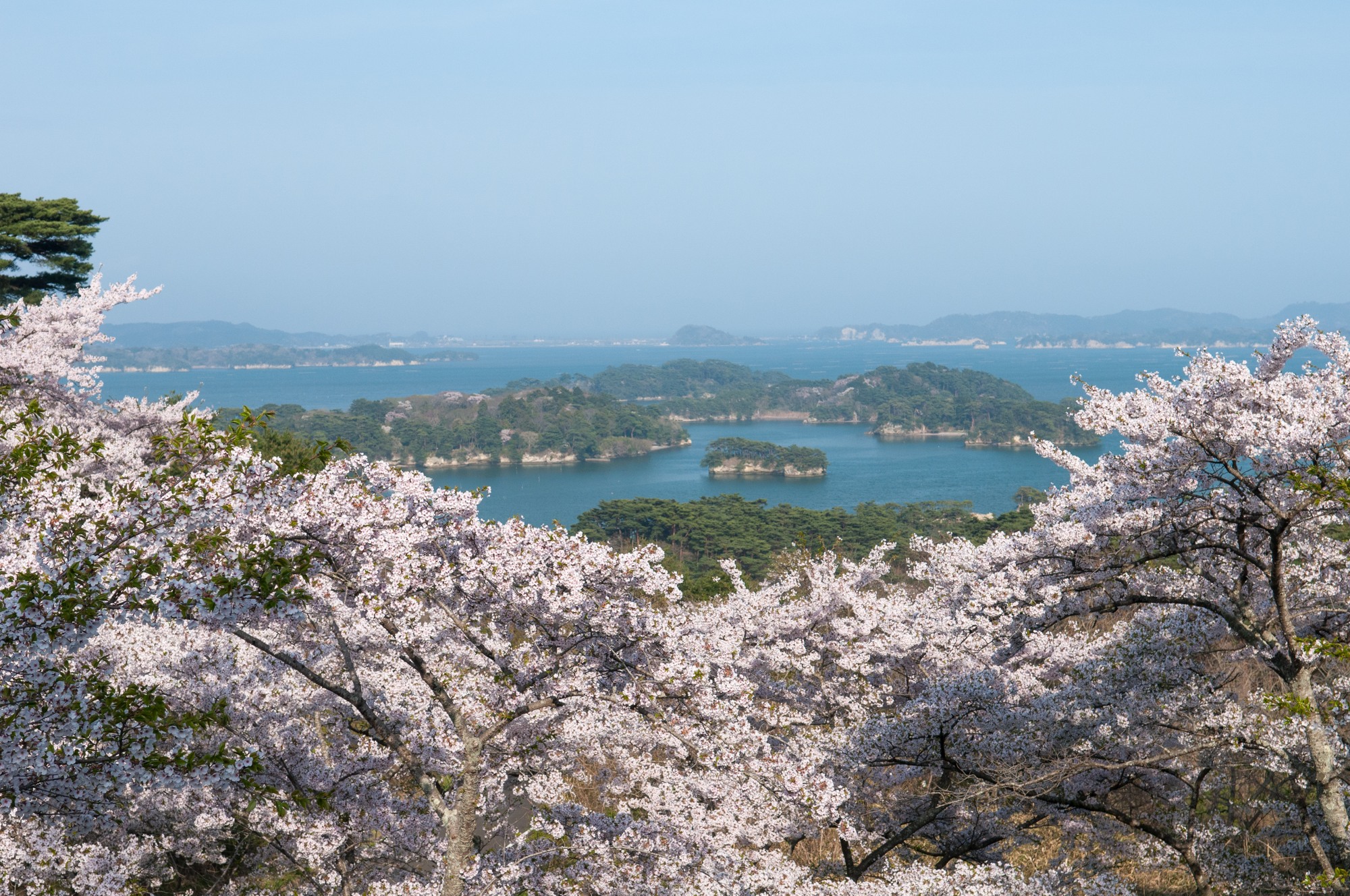 すでに駐車場の辺りより桜の向こうの松島湾が見えます