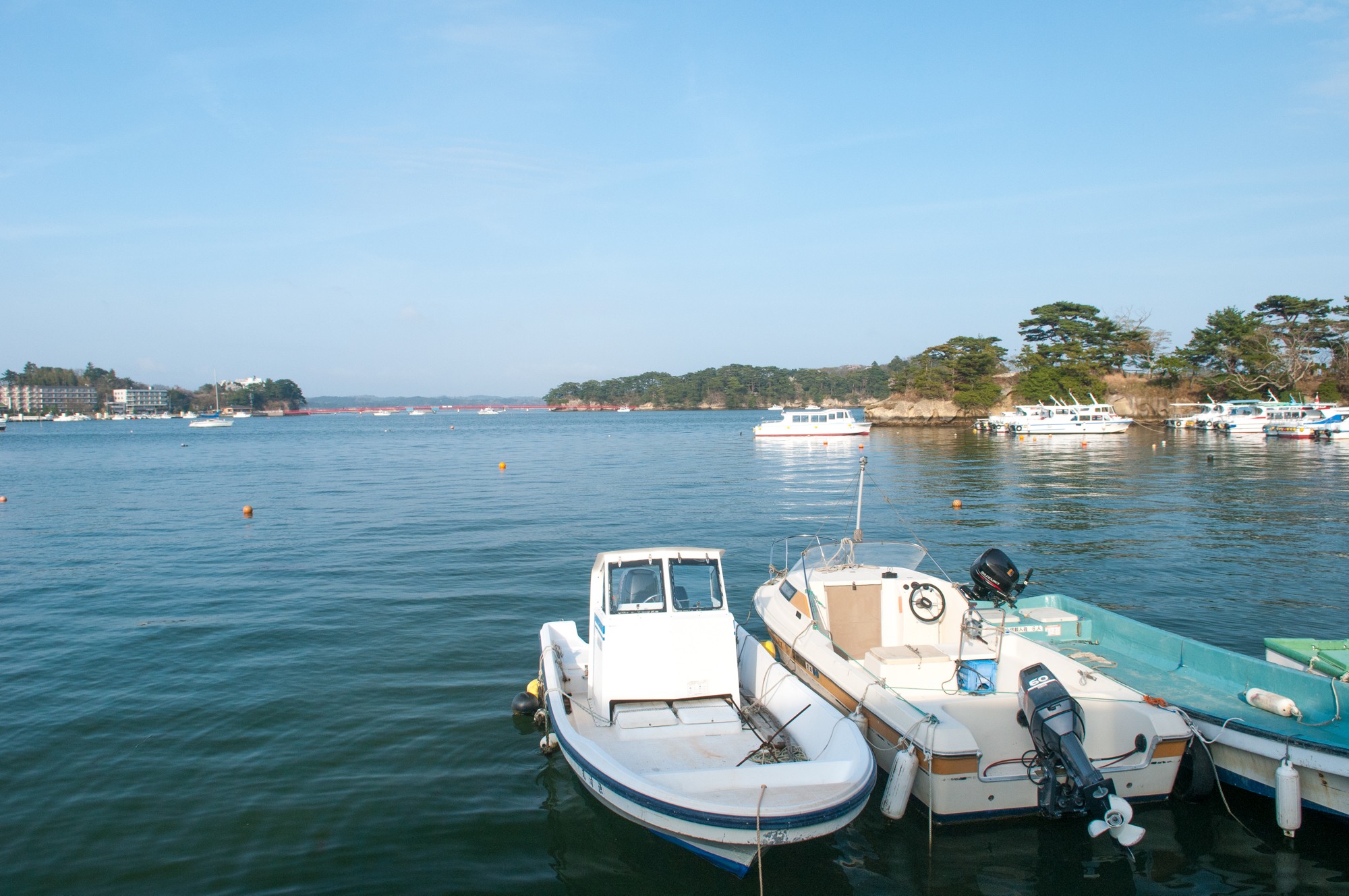停泊しているボートと遠くに見える福浦橋