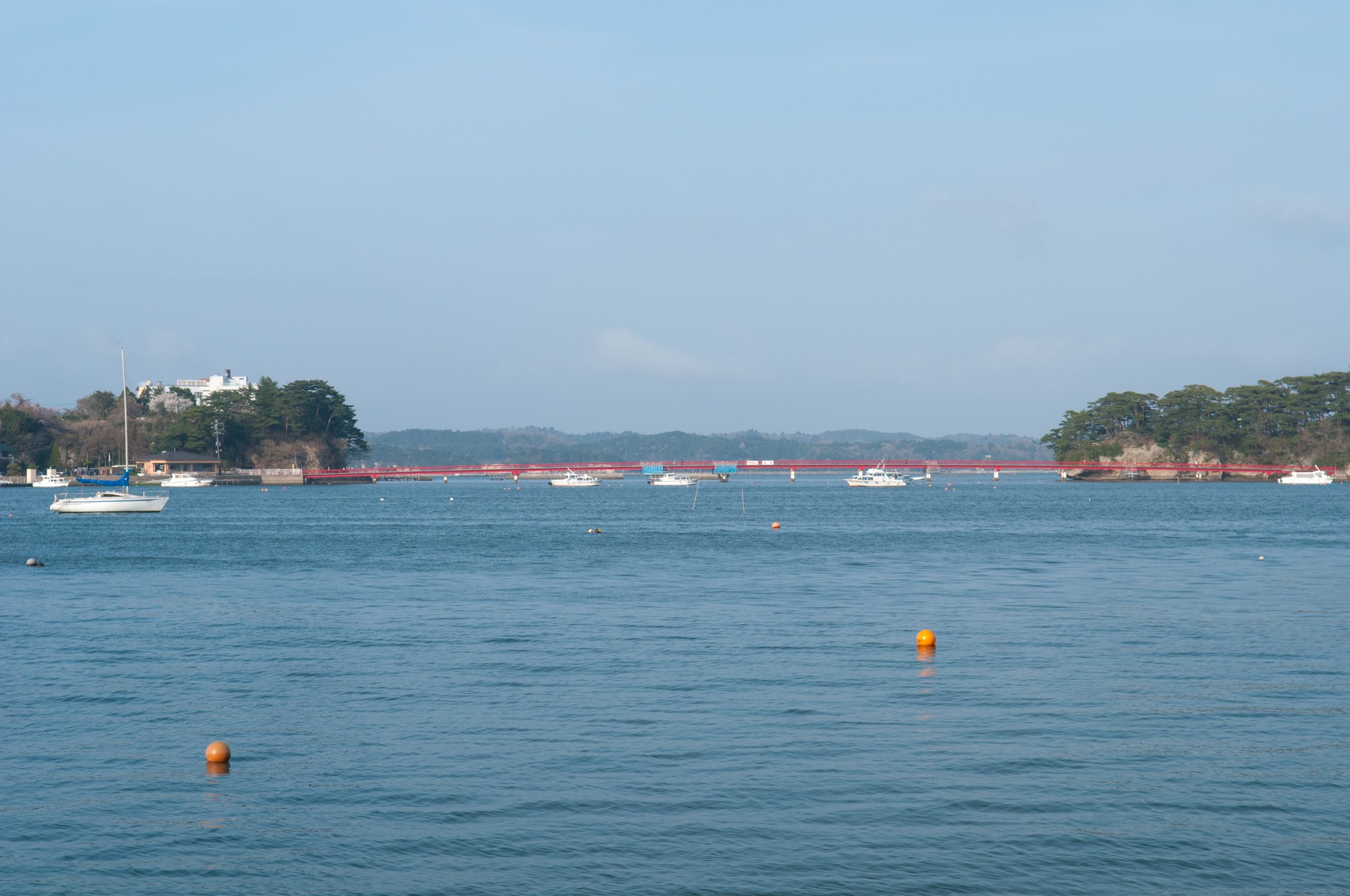 先程、展望台より見えた赤い福浦橋もよく見えます。観光船船着き場や五大堂の近くにあります。