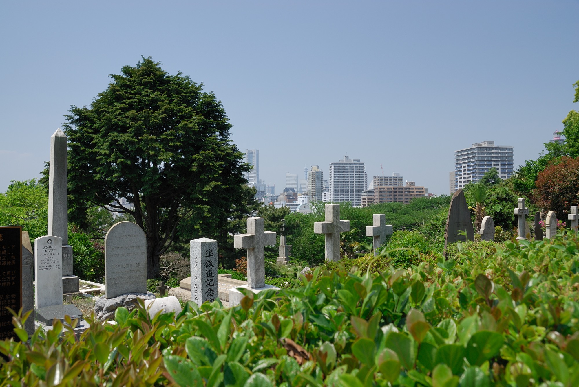 外人墓地は港の見える丘公園から歩いてすぐの場所にあります。中に入ってみようかとも思いましたが,時間もあまりないので道路から見ながら歩いていきました。墓地の向こうには横浜の街を臨むことが出来ます。