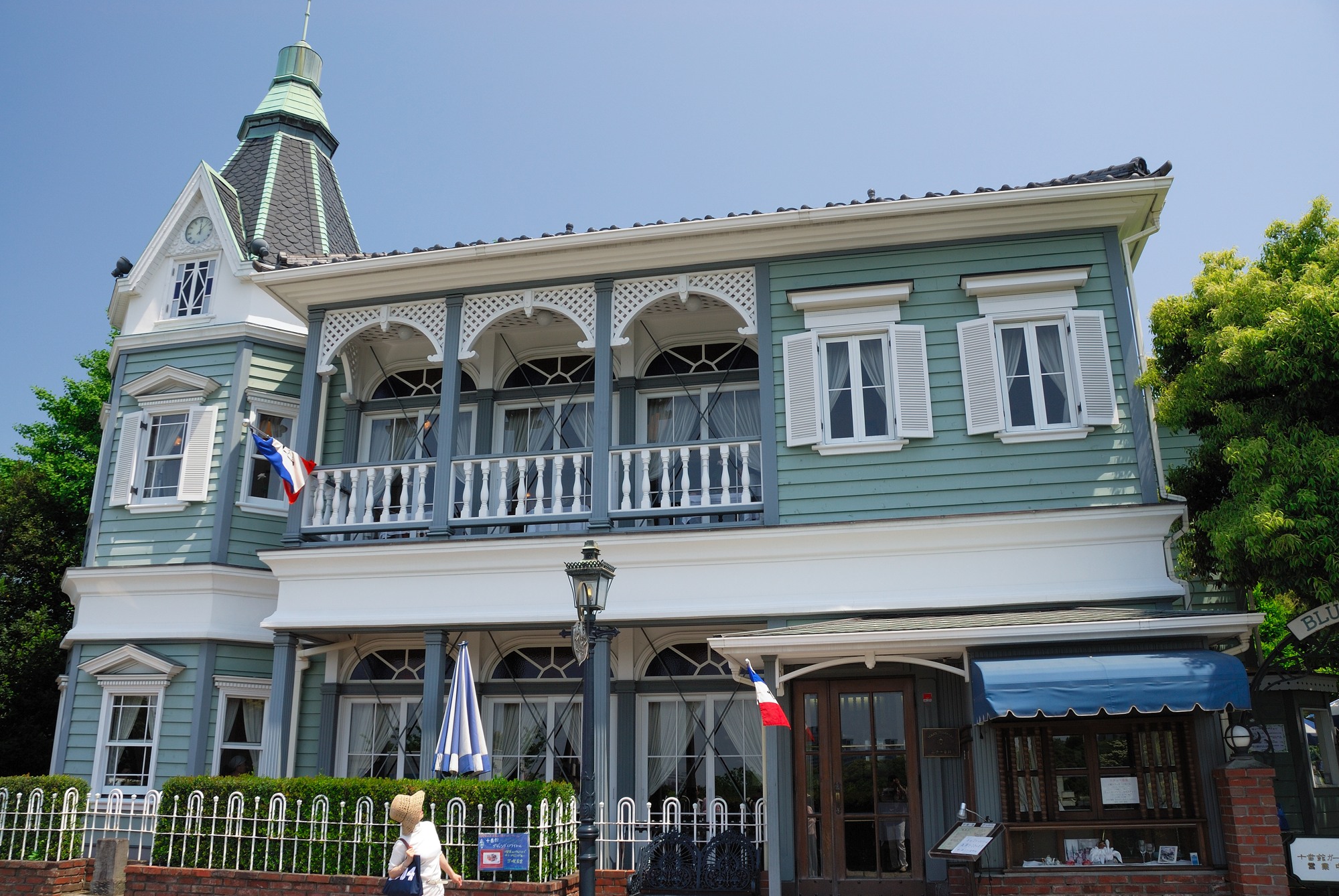 外人墓地前の明るい道をプラプラ歩くと,すぐに目の前に洒落た洋館が見えます。これは山手十番館で,明治100年を記念して1967年(昭和42年)に建てられました。1階が喫茶店,2階がレストランになっています。