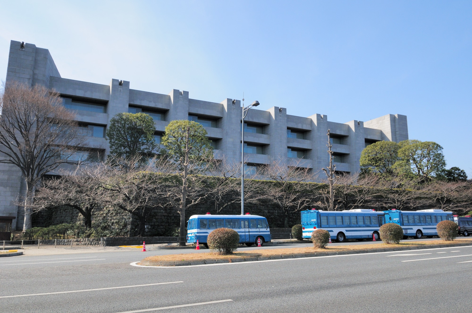 左側にあるお濠,これは桜田濠と言いますが,上から見下ろす眺めは実に素晴らしいもので,春のお花見シーズンはさぞかし美しいだろうなあ,と思わされます。正面はるか向こうには,桜田門前にそびえたつ警視庁の三角ビルが見えます。途中右側には国立劇場と最高裁判所があります。本日は右翼の宣伝でもあったのでしょうか,機動隊が多数出動して,ものものしい警戒を行なっていました。