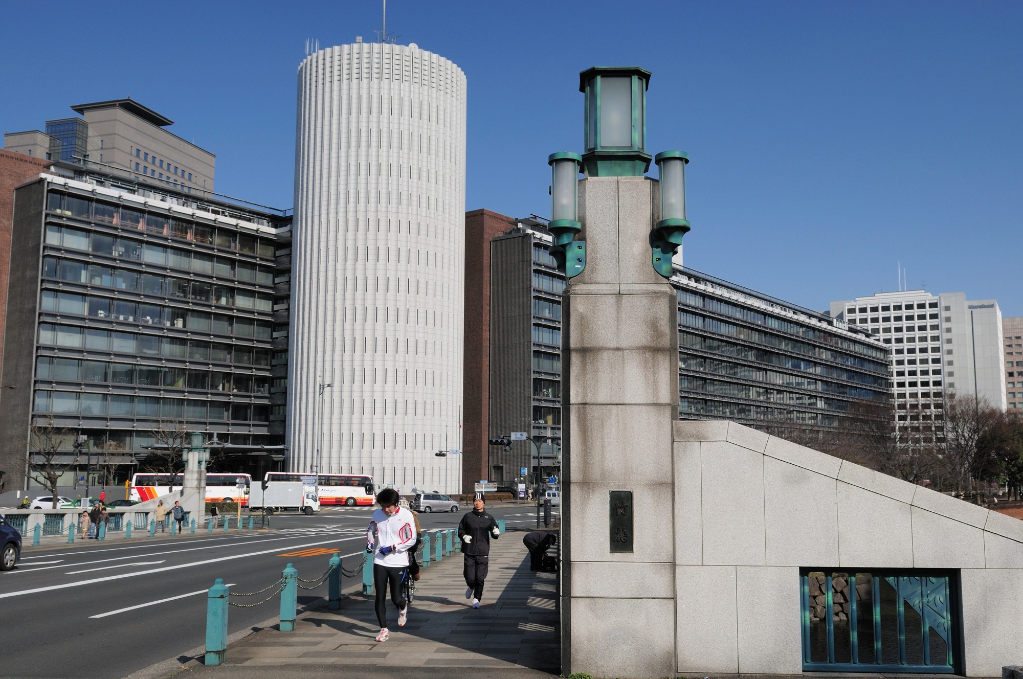 大手門前を過ぎると,いよいよ皇居一周も終わりに近づきます。正面には東京消防庁が見えてきます。お濠をはさんだ向こう側には,毎日新聞社の本社が見えます。