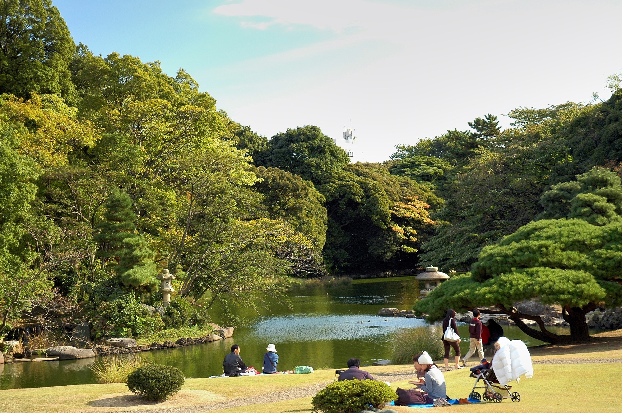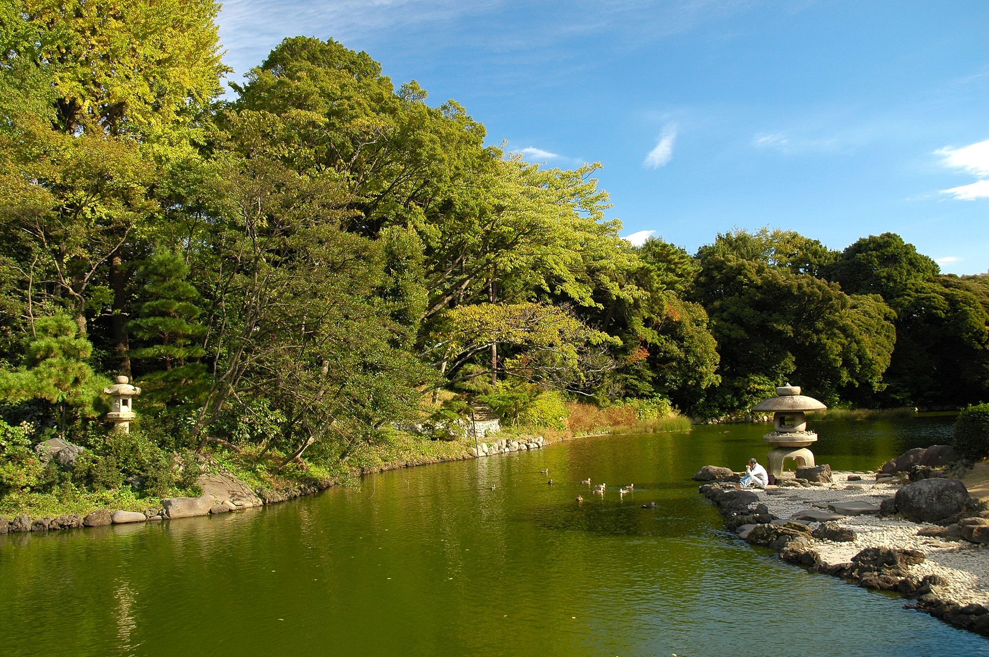 気付いたらどこからか懐かしいハーモニカの音も聞こえてきました。見ると池に突き出た灯篭のほとりで、おじいさんがハーモニカを吹いているのです。いやはや、何とも優雅な風景で、とても都心の公園とは思えない感じでした。あまりにも絵になるので、そこでも写真をパチリ、です。