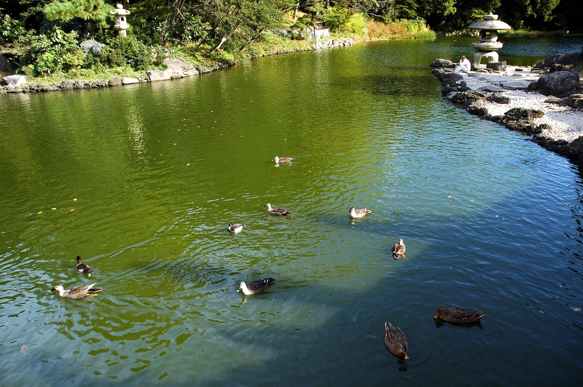その橋から池を見ると、何と! カモがたくさん泳いでいます。20羽くらいいたでしょうか。集まったり散り散りになったり忙しく泳いでいるサマはとても可愛いものでした。いや、これは見ていて本当に癒されます。