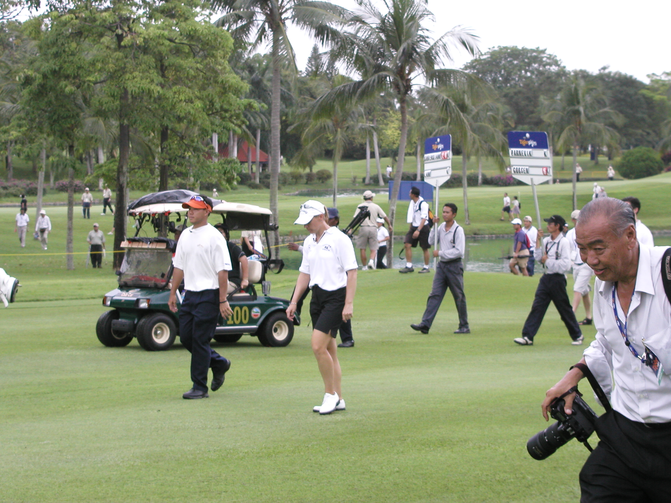 見ると、やはり間違いなく本物のアニカです! 有名なグーセンやパーネビックも一緒です。集まってティーグランドで素振りを軽くしていますが、距離は2メートルほどでしょうか。世界的に有名なプロをこんなに近くで見るのは初めてなので、既にして興奮状態です。なおこの3人に加えてシンガポールのプロであるラムも参加します。彼は初めて見ましたが、まだ童顔のポッチャリした青年で可愛らしく見えました。