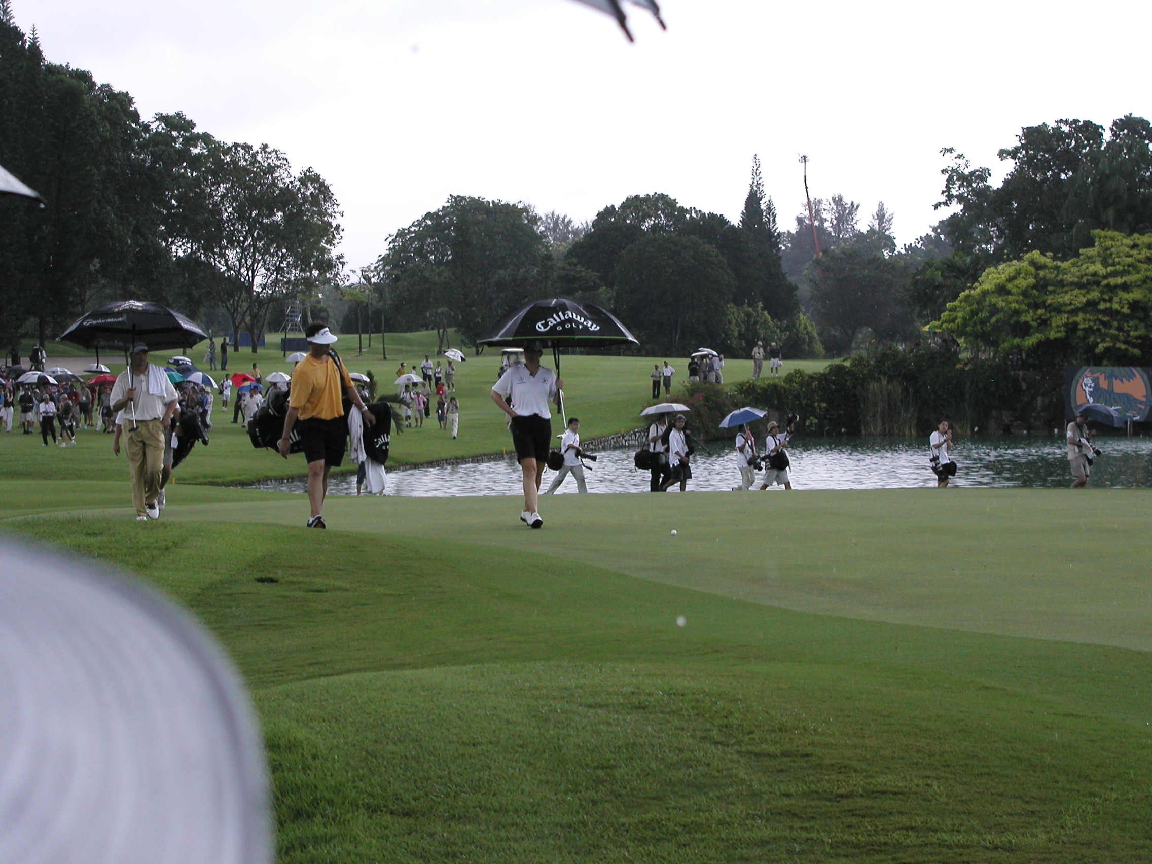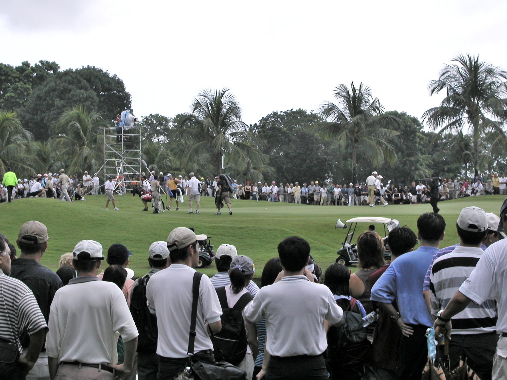 そこでその女性に聞いてみたら、昨日見に来た時に長男がちょっとはぐれ、その時にたまたま近くにいて知り合ったらしく、「今日も会えたね、お姉ちゃん」などと話していました。この方はIさんといい、TigerSkinを見るためにシンガポールにいる両親をたずねて日本よりわざわざ来たくらいのゴルフ大好きな方で、本日は一日一緒に見て回りました。長男にも優しく、非常に真面目ないい方でした。