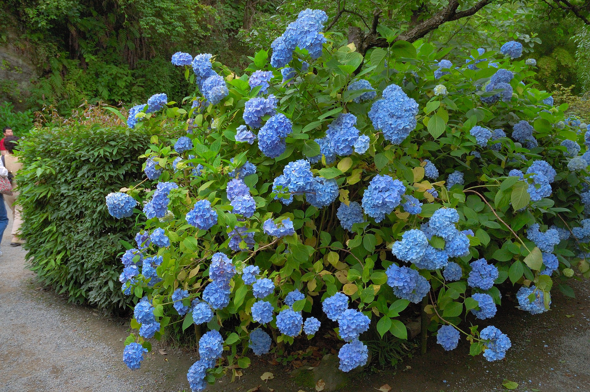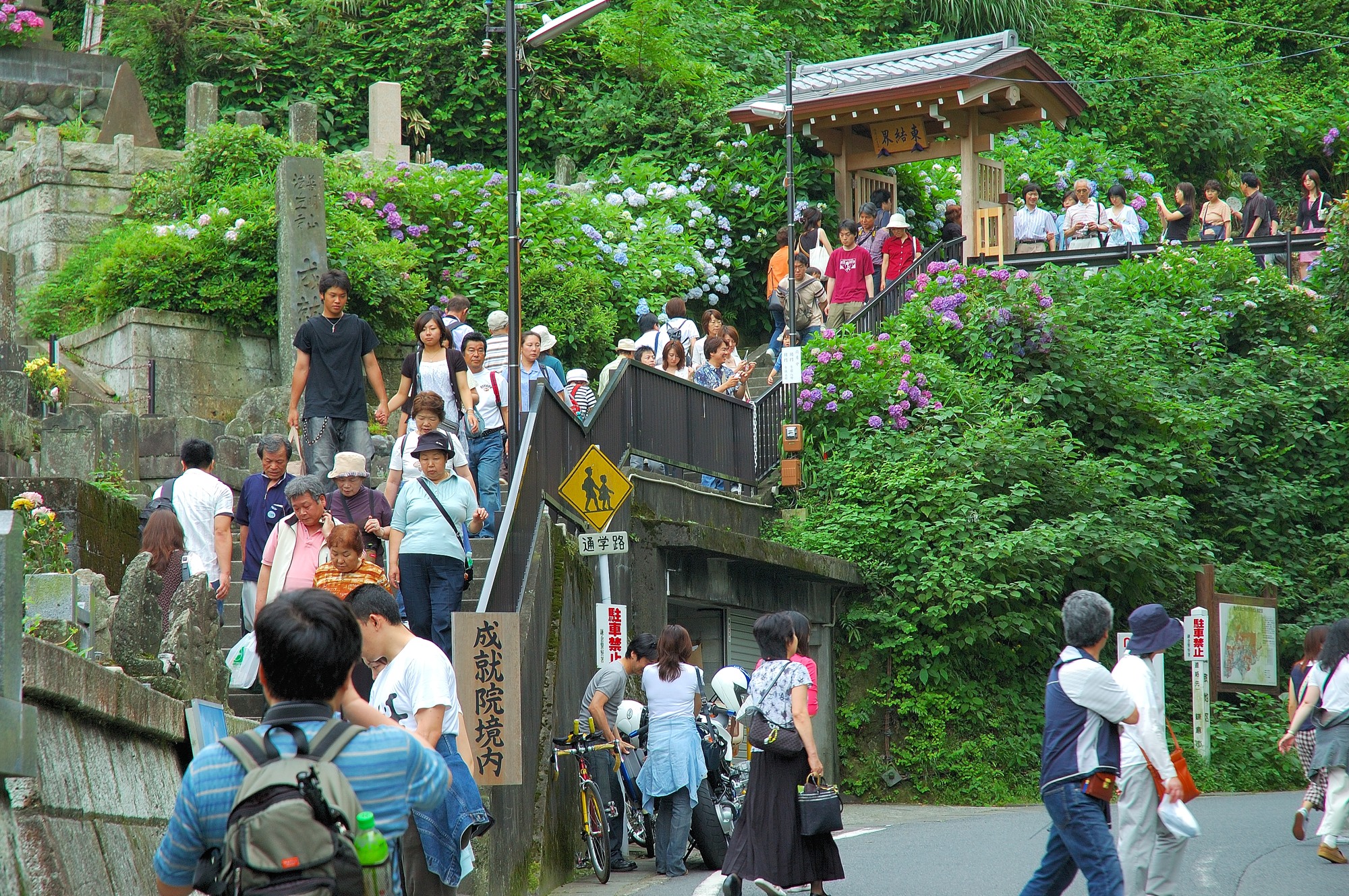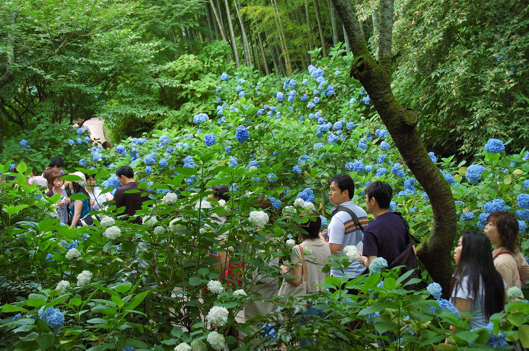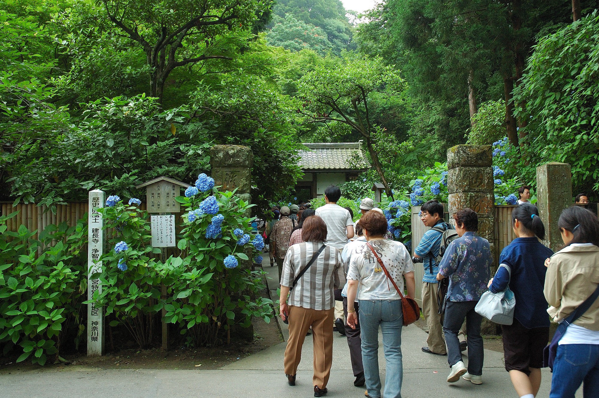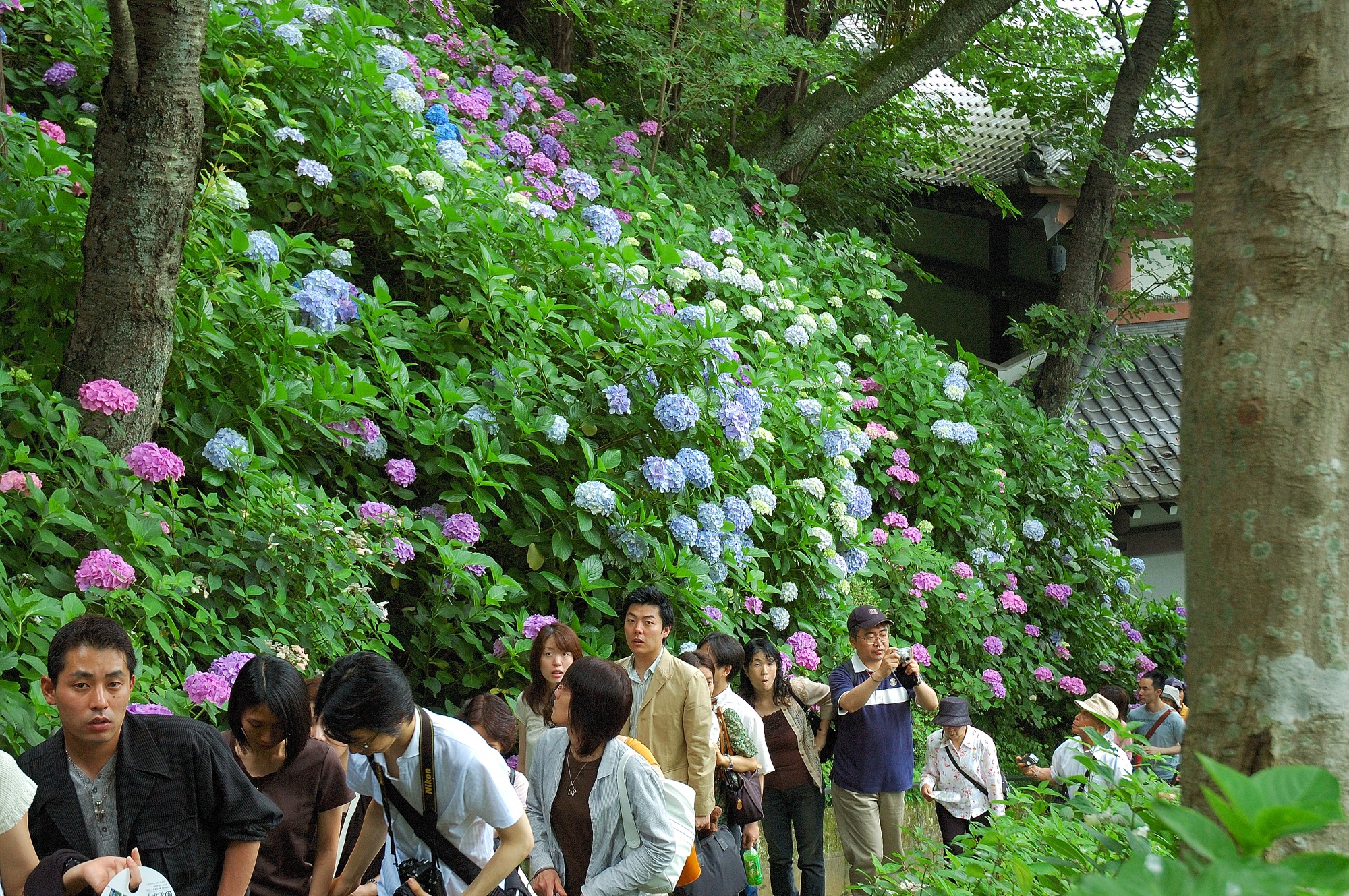 すぐ脇からあじさいの散策路が始まりますが、見るとたくさんの人が既に並んで待っているではないですか! いや、これはすごい。ディズニーランドのアトラクションを待つような感じで多くの人が散策路に入るために並んでいるのです。そう、散策路は狭くてしかも皆ゆっくり見てあるくため、中は渋滞し外まで待つ人があふれるのです。我々も並びましたが、散策路に入るまで30分以上も待たされてしまいました。しかし後で分かりましたがこの程度はまだまだ序の口。昼過ぎになると更に人が並び入るのに1時間以上は軽く待たされることになります。