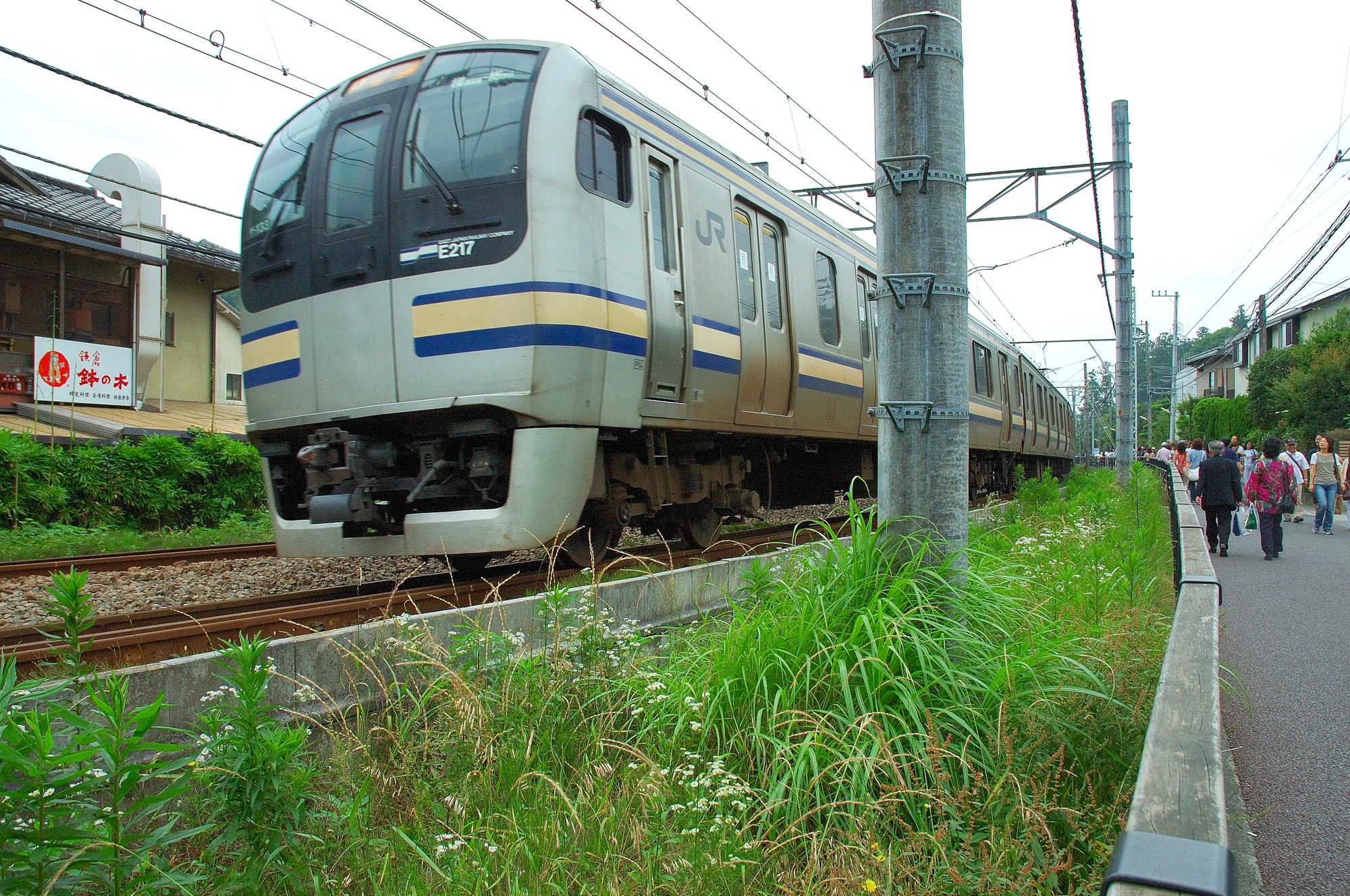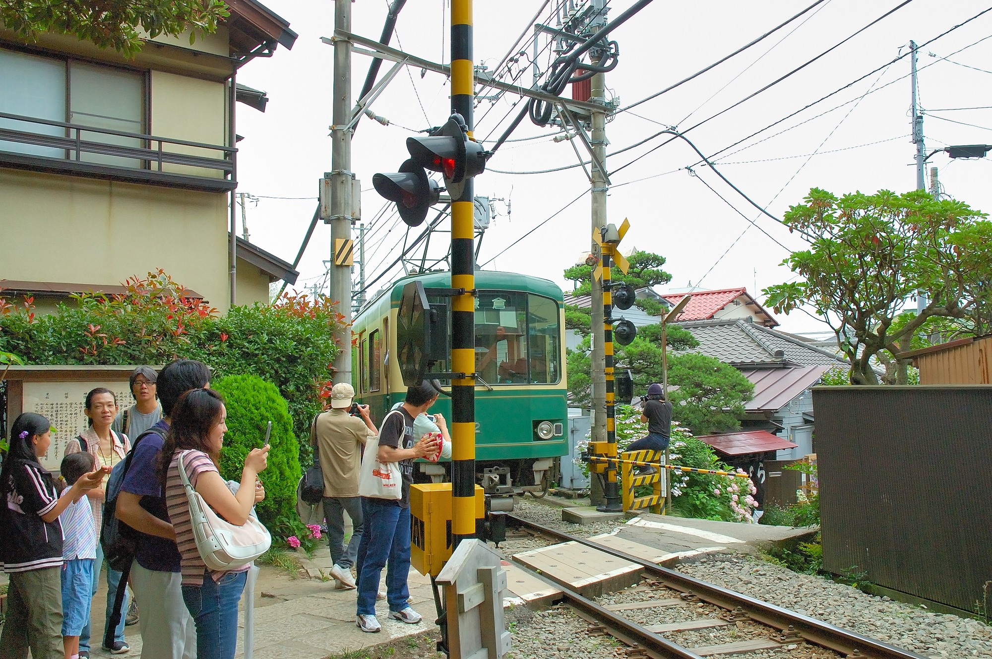 ここはあじさいと言うよりは、その前の踏切が江ノ電の格好の撮影ポイントということで、私のたっての希望で案内してもらったものです。住宅地の中を歩くとほどなく御霊神社の前まで来ました。そこには確かに小さな踏切があります。周囲は住宅地で目の前には御霊神社があります。見ると既にカメラをかかえた人が何人かいましたが、聞いた所、本日はこれでもまだ人が少なくて、普段はもっと多くの人がカメラを構えて並んでいるとのことでした。