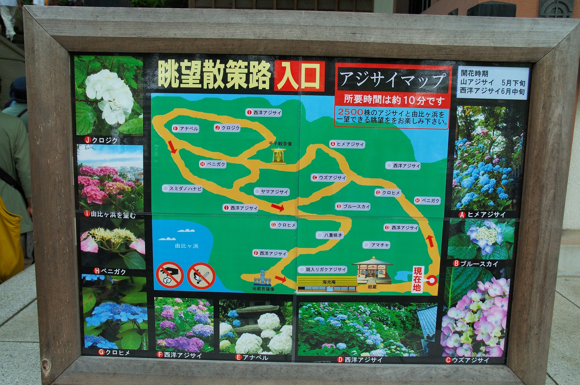 蒸し暑い中ずいぶん並んでようやく散策路入り口にたどりつきました。見るとそこには散策路にあるあじさいの種類が写真付きで説明されています。明月院は姫あじさい1種類で飾っていましたが、この長谷寺は多くの種類のあじさいをたくさん飾っているようです。