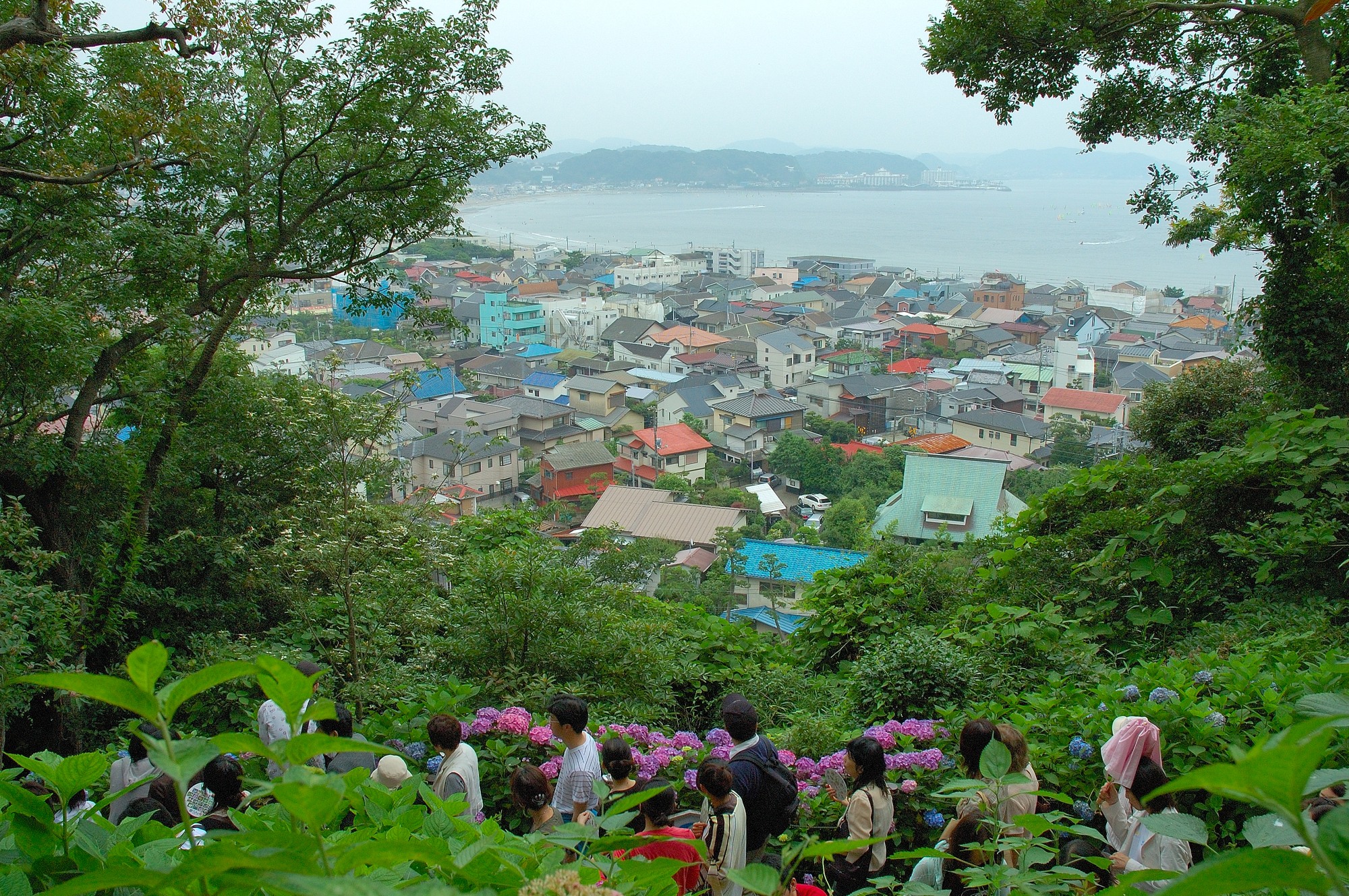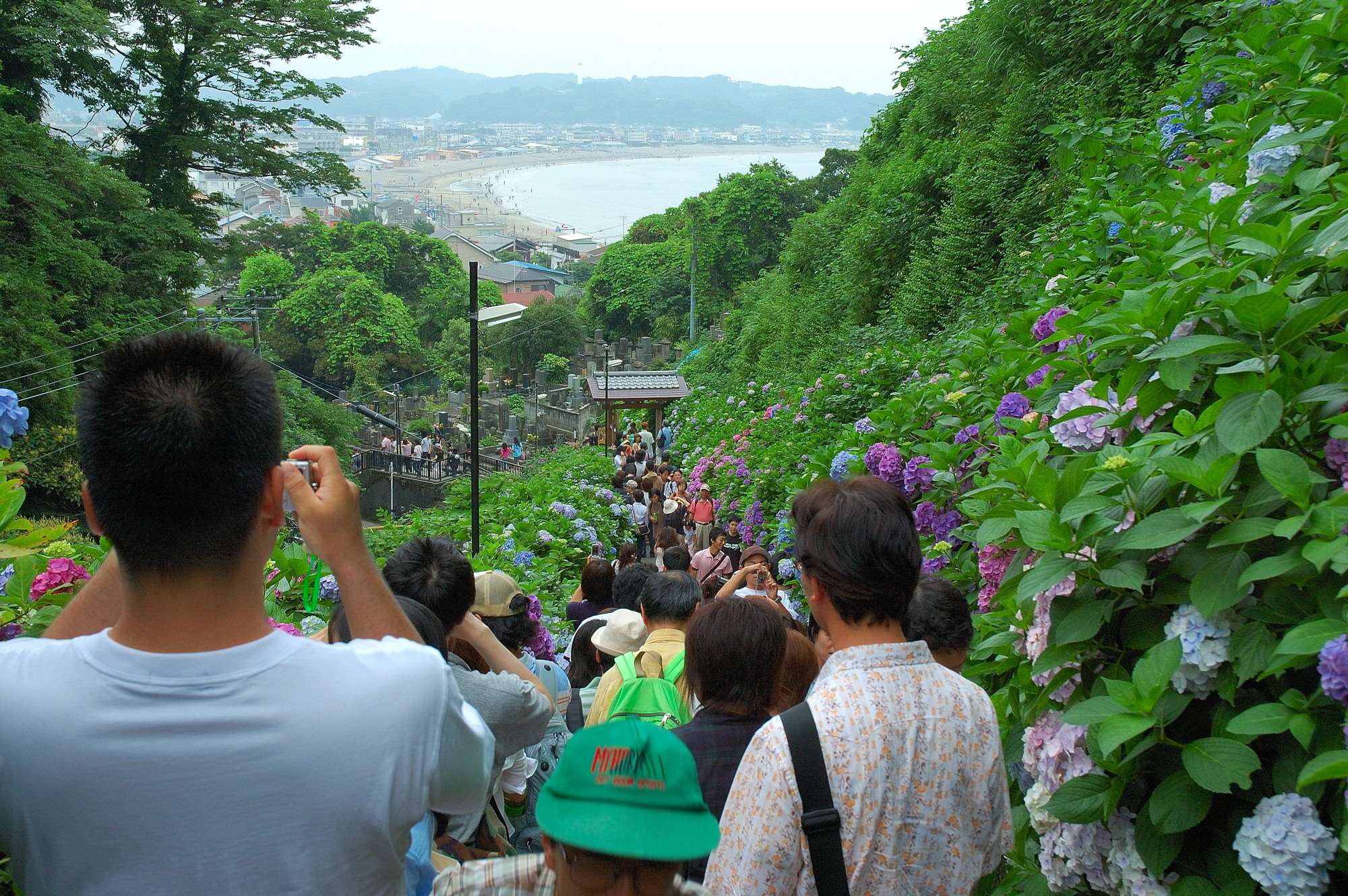 特にここでいいのは、振り返ると下の方に由比ガ浜がのぞめることです。多くの人が由比ガ浜をバックにあじさいの写真撮影をしていました。