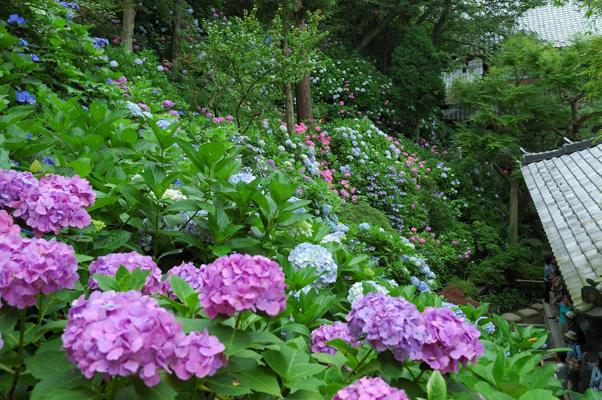 それにしても大勢の人がいるもので散策路は大渋滞です。周囲はあじさいが咲き乱れておりとても綺麗。先の明月院は姫あじさい1種が咲き乱れていて、それも綺麗でしたが、この長谷寺は多くの種類のあじさいが混在して咲いているので、別の意味で楽しむことが出来ます。