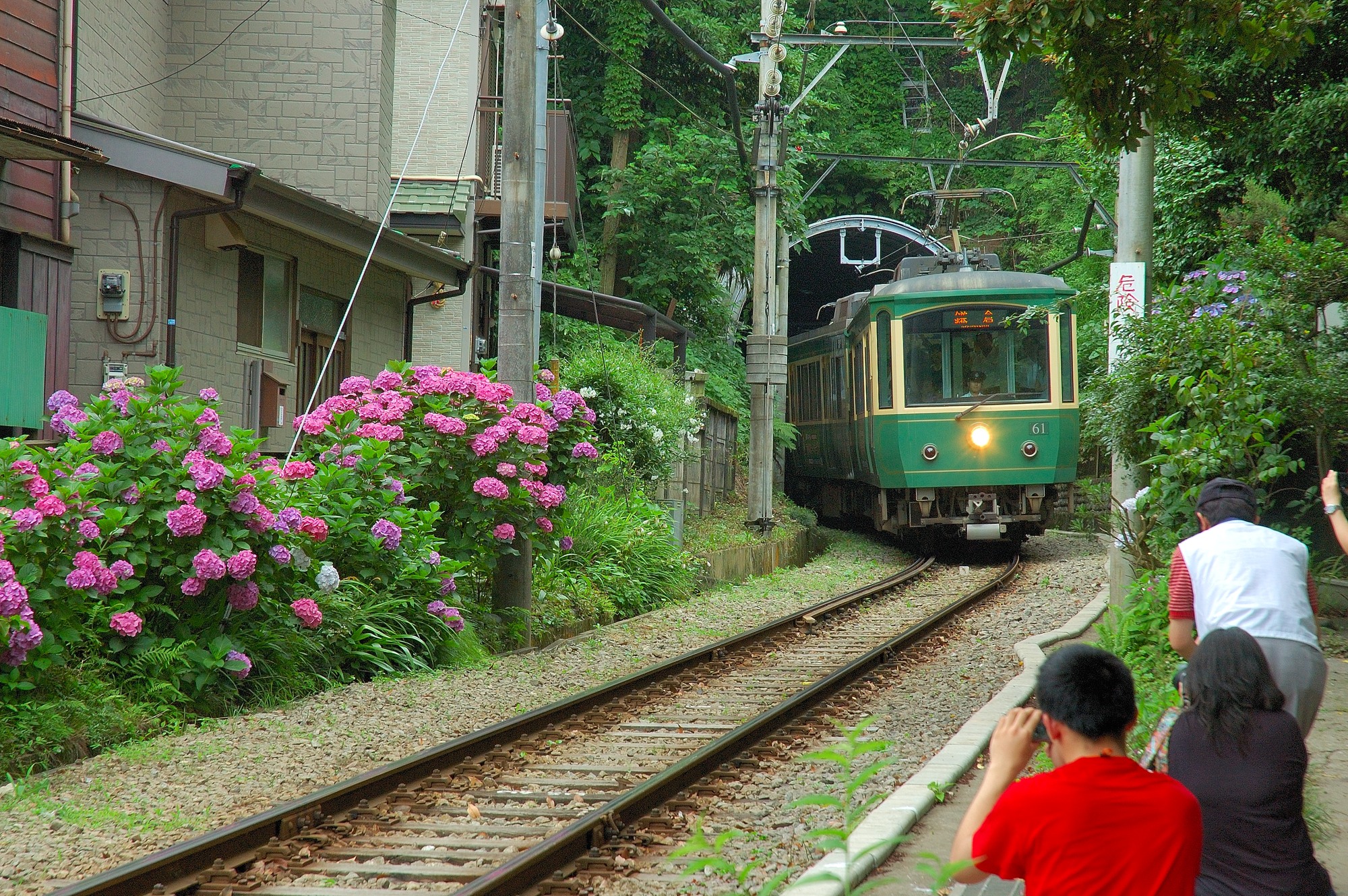 トンネルから出てくる江ノ電とあじさい