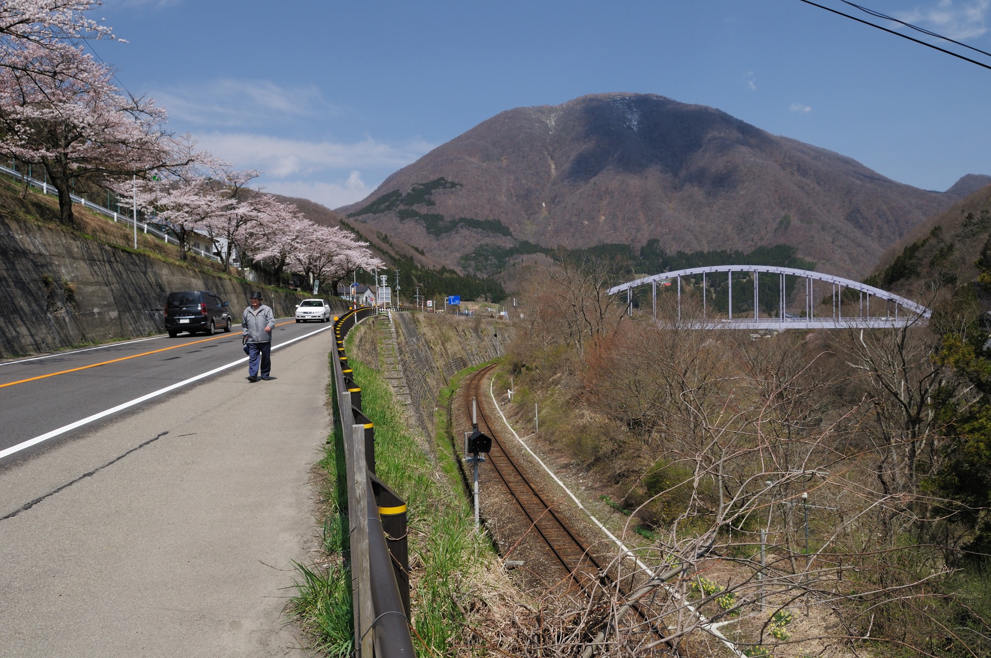 1日に数本しか通らない鉄道を見ることが出来るとばかり、カメラを持って踏み切りへ走ります。すぐ脇は塔のへつり駅でそこに列車が入り止りましたので何枚か写真を撮ります。周囲には同じようにカメラを構えた人が多くいました。