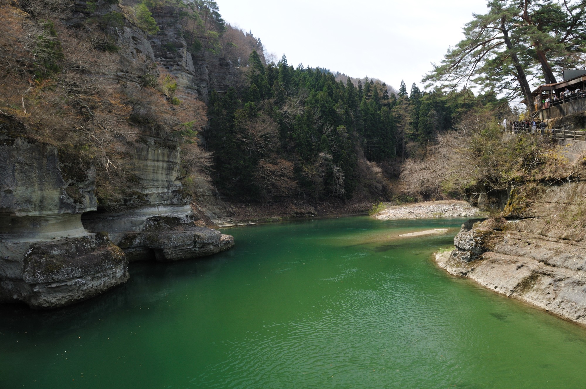 「塔のへつり」とは変な名称ですが、「へつり」とは会津方言で川に迫った険しい断崖を意味します。それらの断崖が塔のように見えるのでこの名前が付いたとのことで、紅葉の時期は大変美しいようです。郡山からは一般道を通り1時間少しで到着です。
