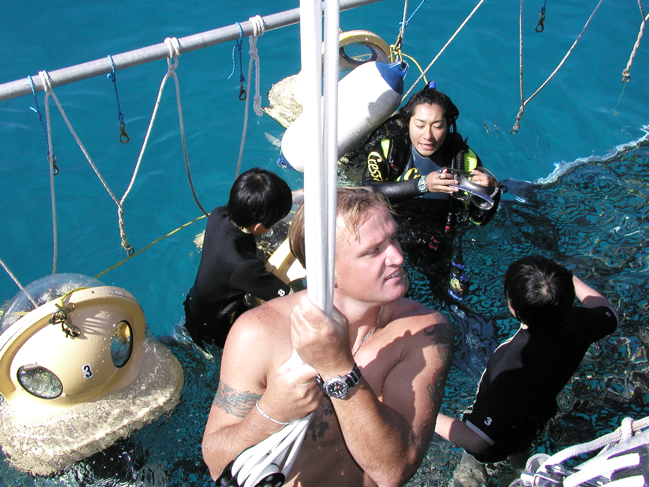 食べ終わったらいよいよ本日のメイン・イベントです。ここでは、シュノーケリング、ダイビング、小型潜水艦での海底探検が出来ます。今回私たちはシュノーケリングをしましたが、ダイビングもインストラクターの方がいるので初心者でも楽しめるようです。インストラクターには日本人の方も何人かいるので安心です。またオートバイみたいな潜水器具にまたがっての水中散歩も楽しめます。