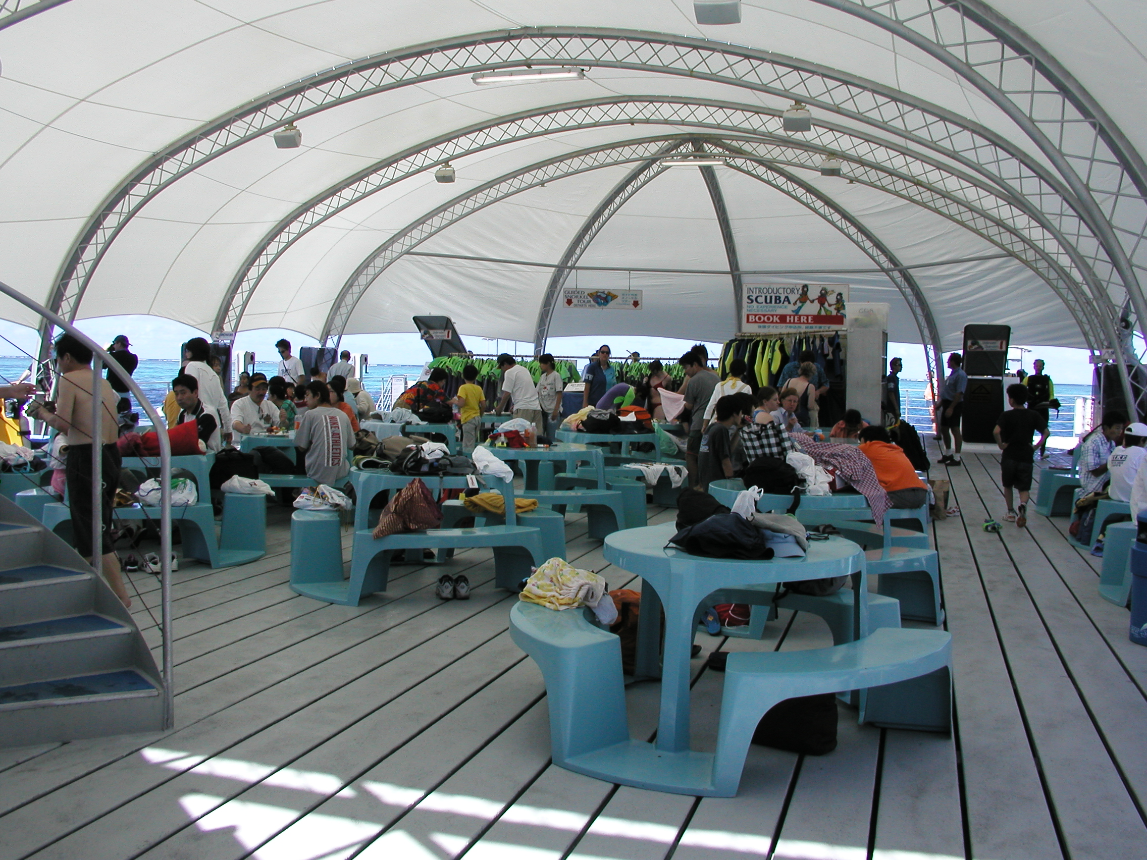 2階建てになっており、1階にはテーブルと椅子が並び簡単なランチが取れ、更衣室から各種の潜水用具置き場もあります。シュノーケリングやダイビングはここから行きますし、小型潜水艦も出ています。2階は1階の半分くらいの面積で日光浴が楽しめるようになっています。