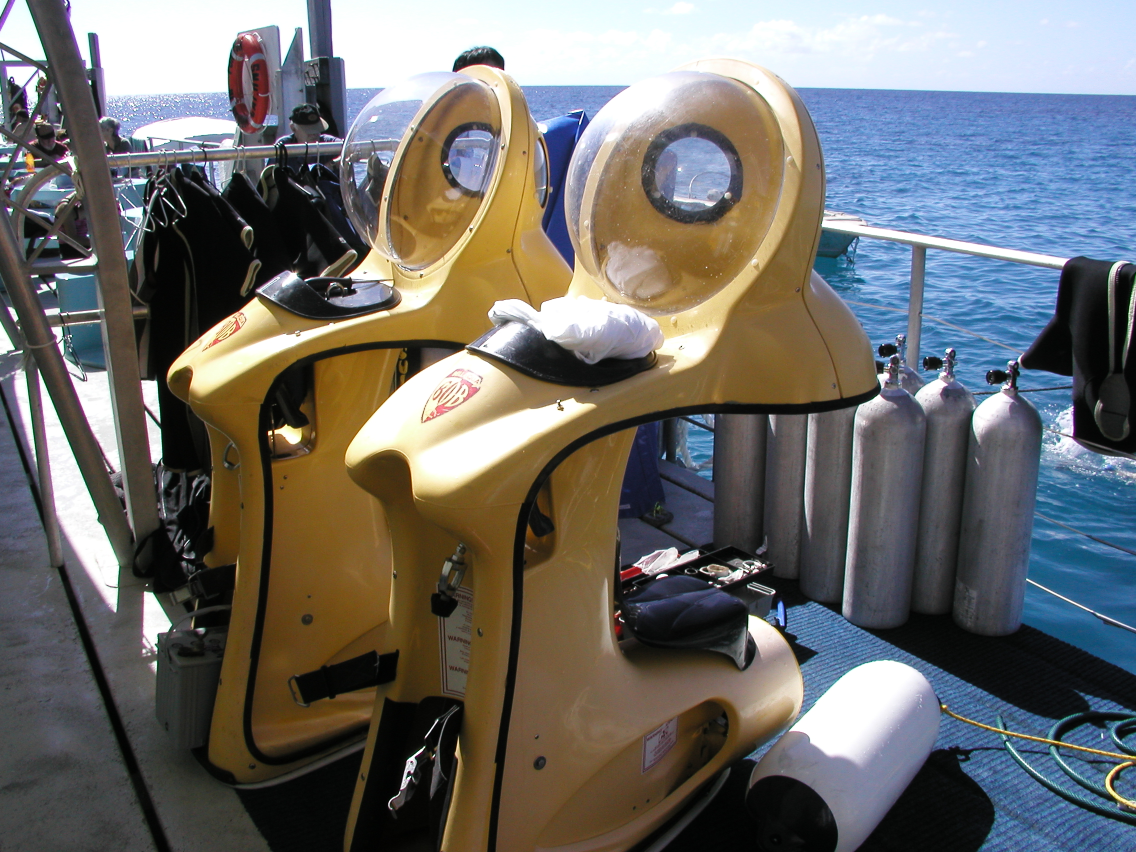 乗り方は簡単でちゃんと日本人のインストラクターの方がいて教えてくれます。その方は海底でも一緒に行動してくれますので子供だけでも安全です。まず腰掛にまたがります。次に大きなガラスの球に頭をいれフタをします。そこには酸素ボンベがつながっているので呼吸が出来、しかも密着するので海水が入り込むことがなくゴーグルなどをしなくてもOKです。それで海にはいると、大きな浮き袋がついていてそれが海上に浮かび、そこから海底に長いロープでぶら下がっているので深度10メートルくらいのあたりを漂うことが出来ます。あとは簡単な操作で前進することが出来るのです。これで20分ほど海底にもぐっていましたが、水面に浮かぶシュノーケルとはまた違う海底の景色を楽しむことが出来て、とても良かったと言っていました。