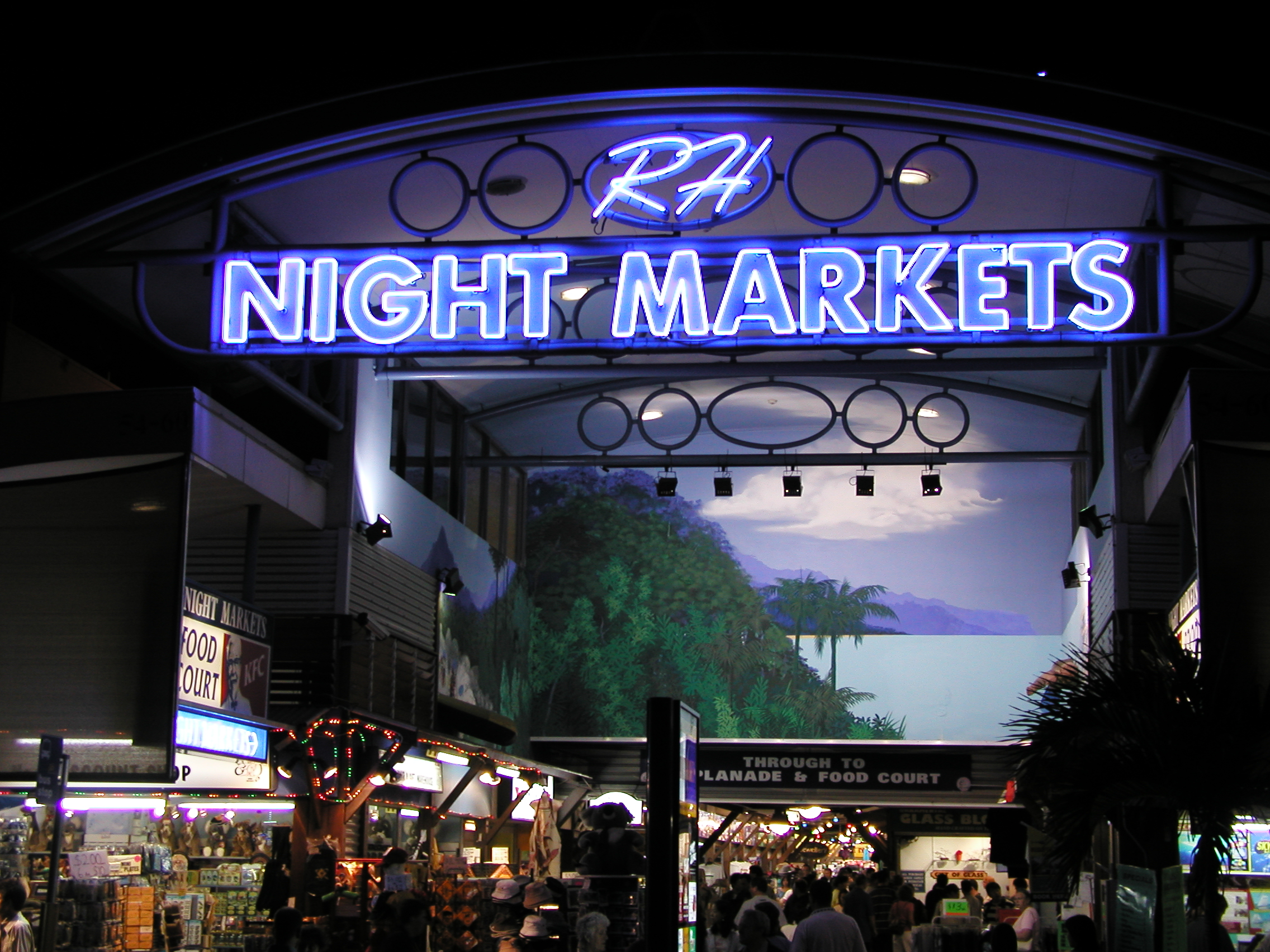 食事の後はそのままホテルへ戻るのもつまらないので、帰り道にショッピングをすることとしました。ケアンズのお店は面白くて、土曜日と日曜日はむしろ早く閉店してしまい、7時頃には基本的にしまってしまう所が多いのですが、「ナイト・マーケット」というエリアだけは夜11時まで営業しているので、そこへ行ってみました。