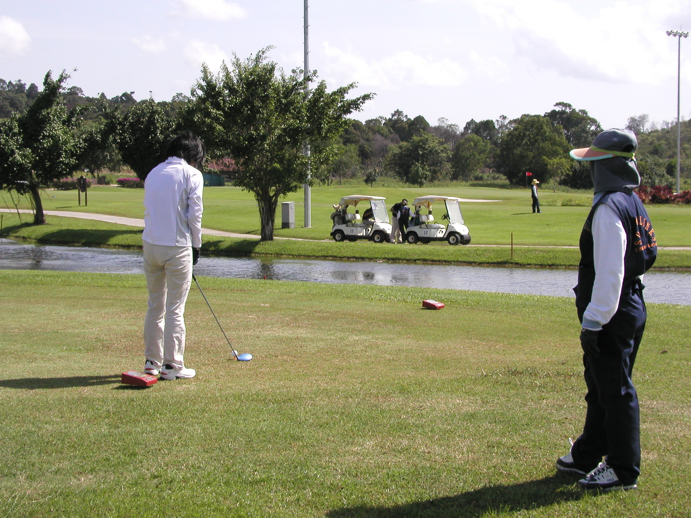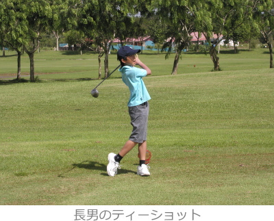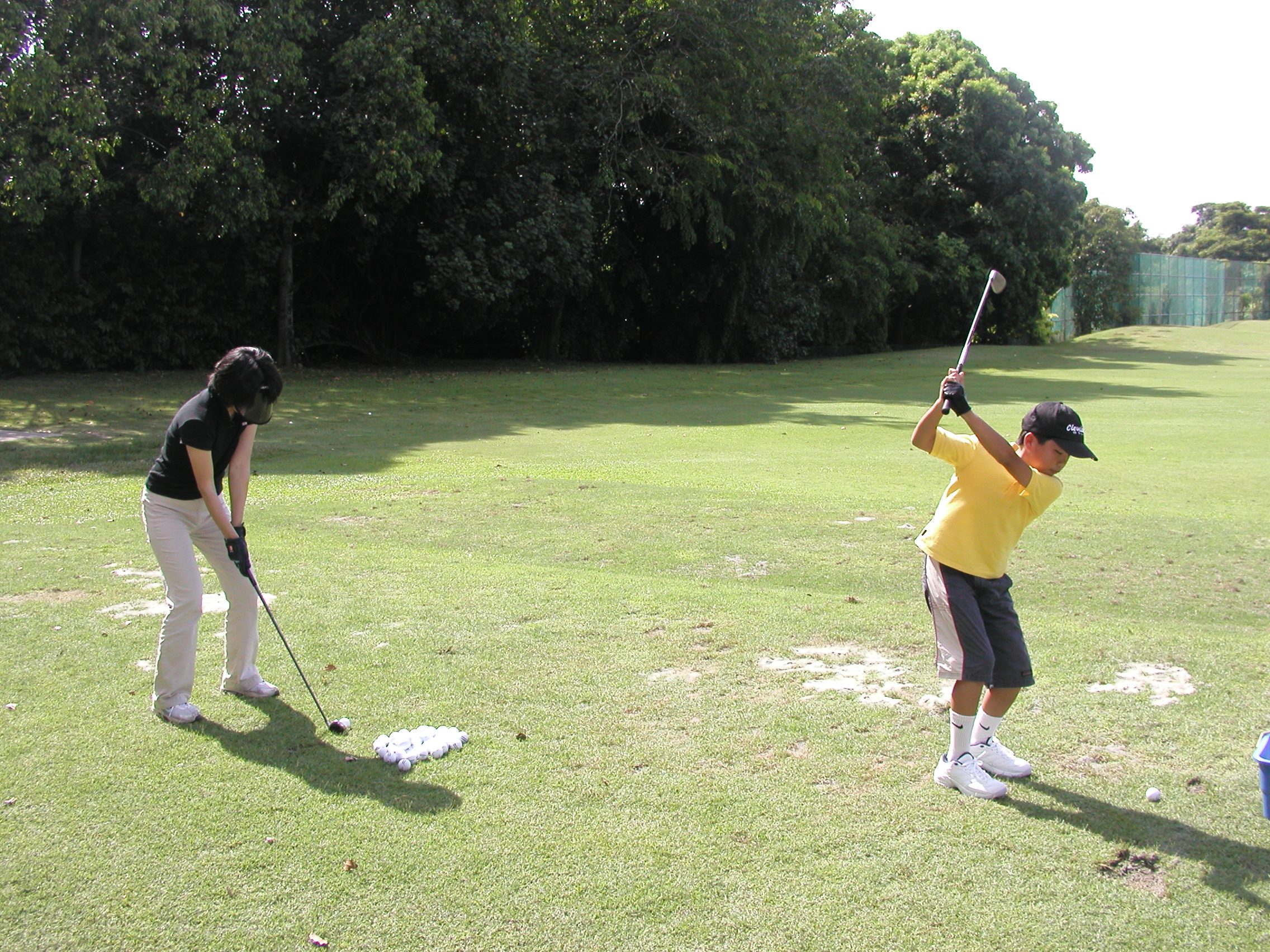 「どたばたゴルフ体験記」にも記載してありますように、私はこちらに来てからゴルフを始め、すっかりハマっています。その後、長男(2004年6月現在、小学5年生、10才)も1年半ほど前から練習だけを始めています。奥さんにもゴルフを始めるようにずっとすすめていたのですが「日焼けするからイヤ」と言って長い間、関心を示していませんでした。しかし突然の心境の変化で3ヶ月ほど前より練習を始めるようになりました。