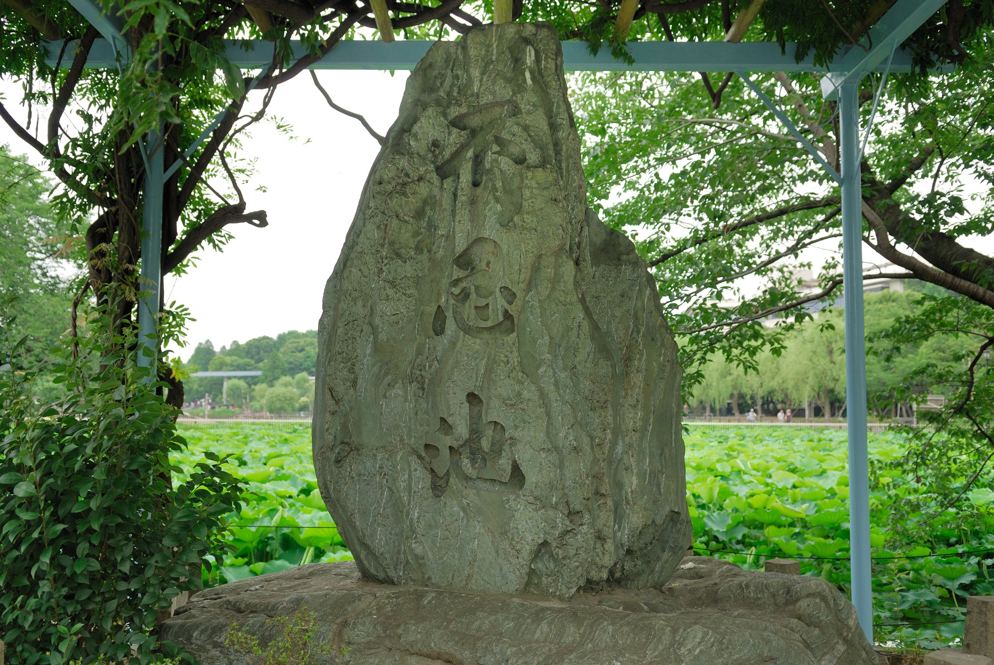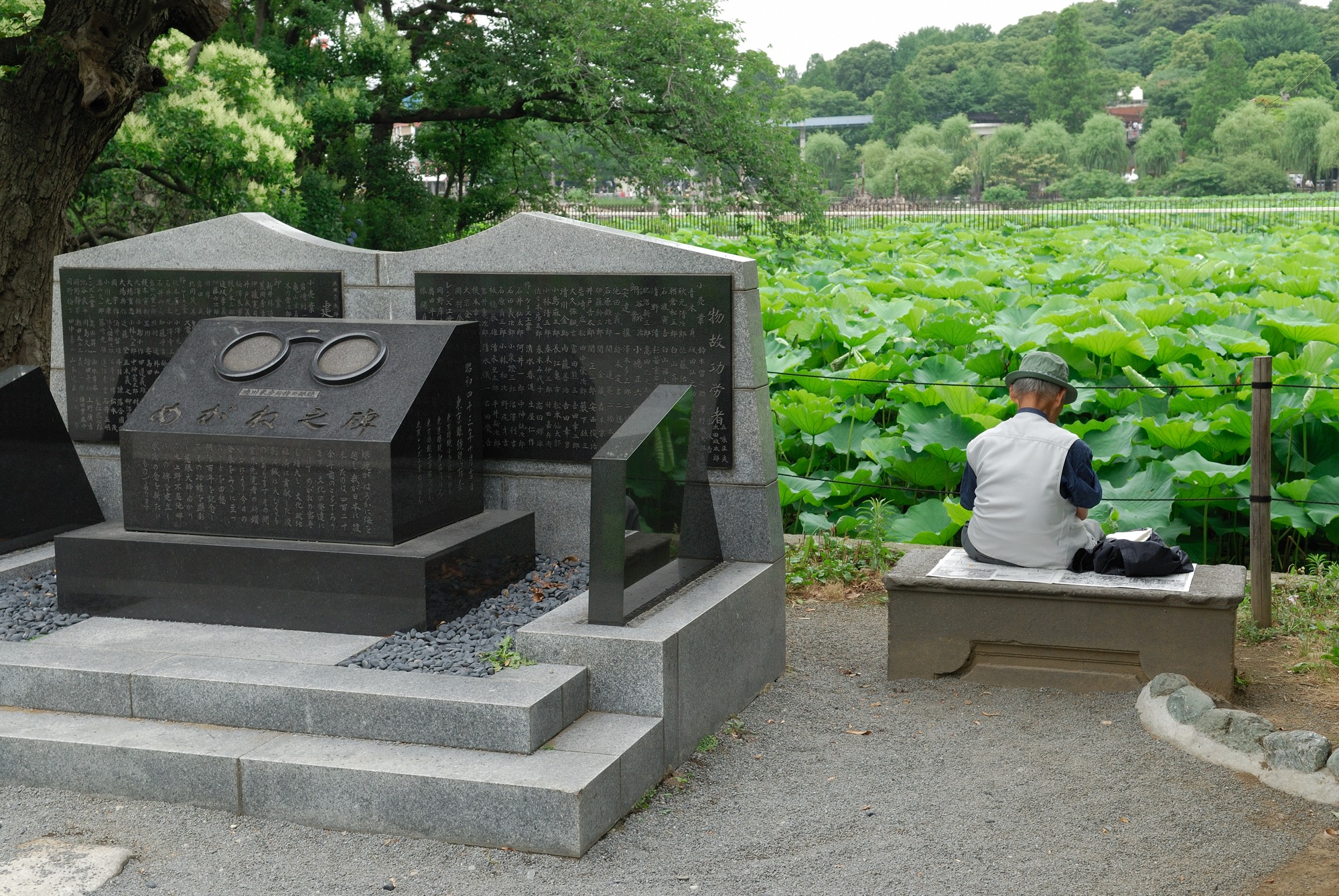 屋台の前を通り過ぎておくに歩くと,不忍池と書かれた石碑がありました。これは初めて見ましたが,こんな石碑があったのですね。その隣には,めがねの碑というのがあり,その脇には年配の男性がたそがれてて座っていました。