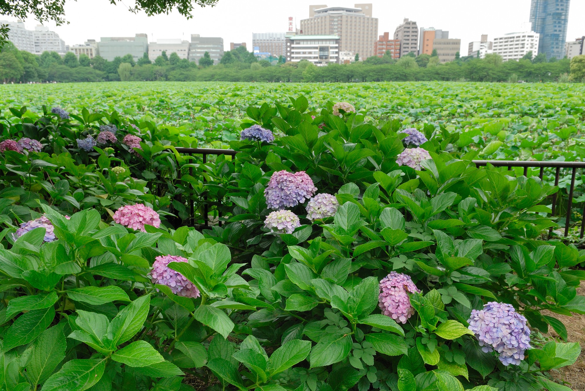 不忍池をしみじみ見るのは久しぶりですが,池一面に蓮の葉があり見事な景色でした。もう少し早ければ蓮の花も満開で咲いていたのだろうな,と思うとちょっと来るのが遅くて残念でした。でもほとりにはアジサイが咲いていたりして,梅雨の時期らしく,とてもいい雰囲気でした。
