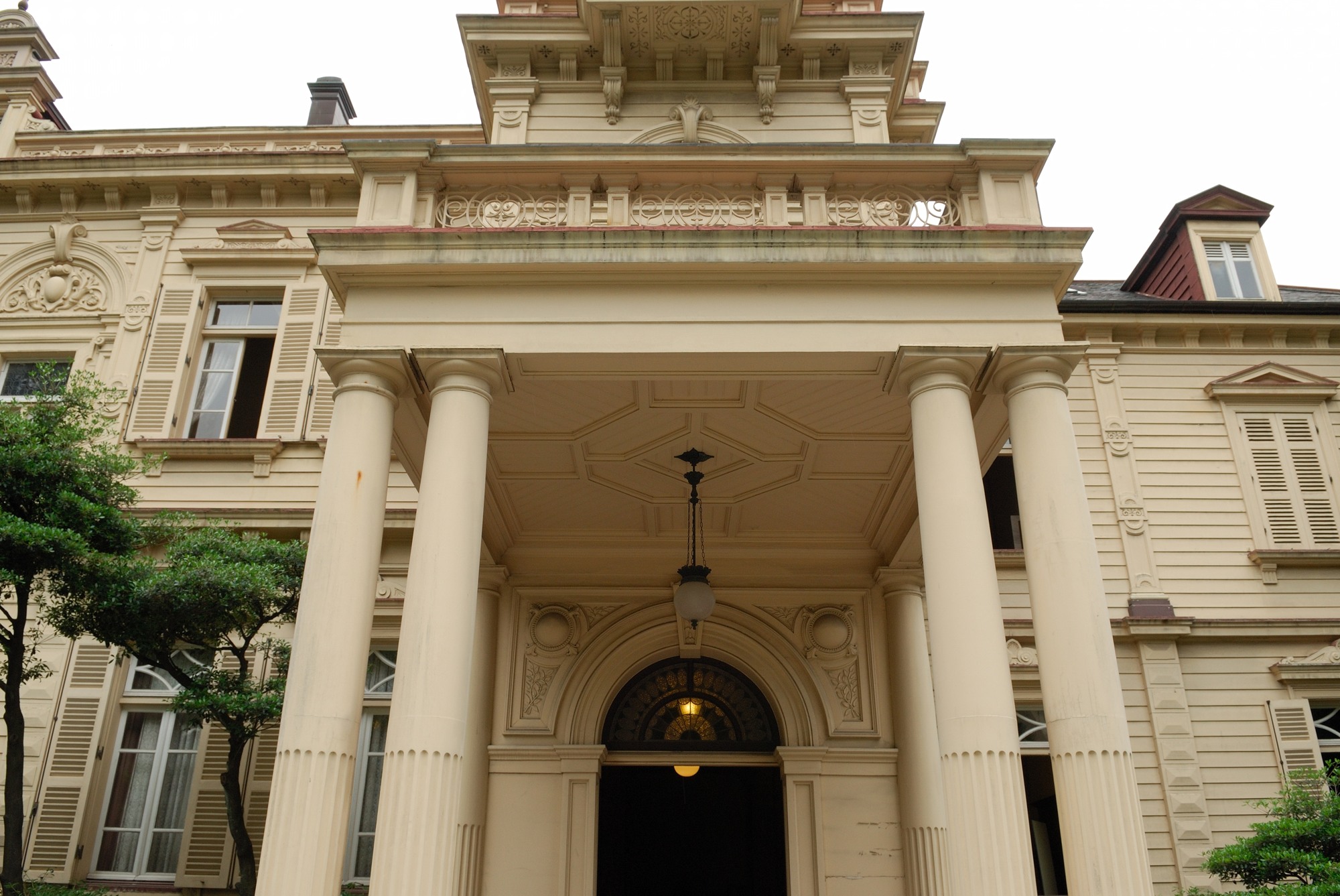入館料を支払い中に入ると,正面に美しい洋館が見えます。これはイギリス人の有名な建築家ジョサイア・コンドルの設計によるものです。ジョサイア・コンドルは日本で洋館を100以上も設計しましたが,旧岩崎邸の洋館はその最古の設計だということです。見ると窓や玄関など,とても美しく設計されており,しばし見とれてしまいます。ではいよいよ中に入ってみることにします。