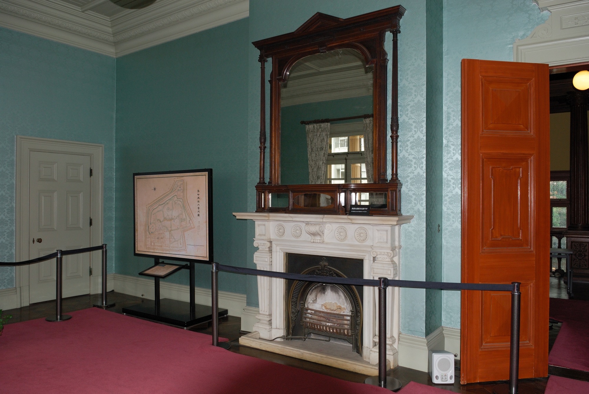 この建物はイギリス・ルネサンス様式で,とても格式ある造りになっています。玄関を入ってすぐの大階段の手すりも美しく,ため息が出そうです。すぐに気付いたのは,どの部屋にも暖炉があること。当時にしてはかなり贅沢な造りとなっていました。