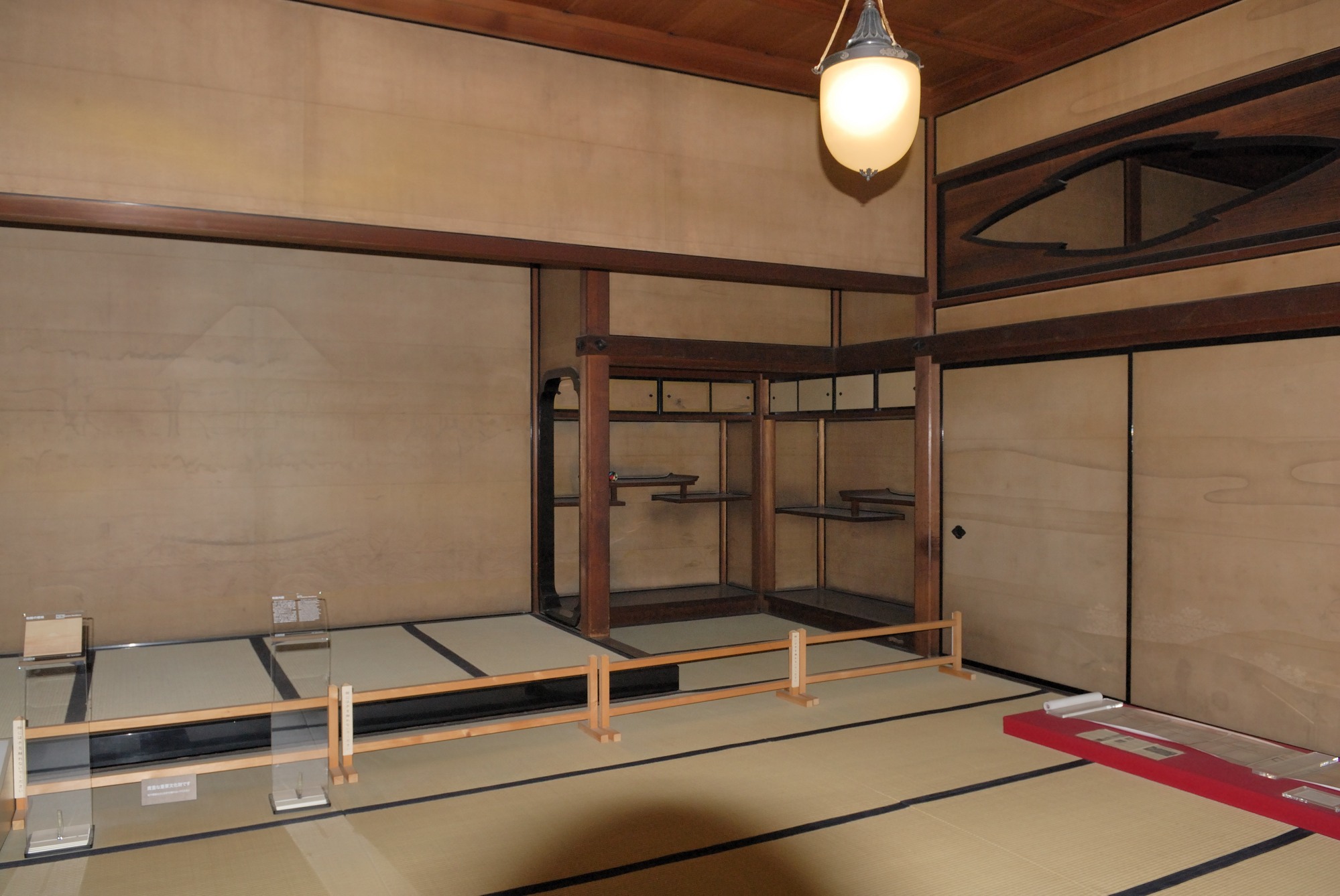 さて洋館の先には,和館が続いています。これは書院造りを基調としており,建設時には建坪550坪に及び、洋館を遥かにしのぐ規模を誇っていたそうです。中の和室では,お茶をたてて飲むことが出来るようになっていました。