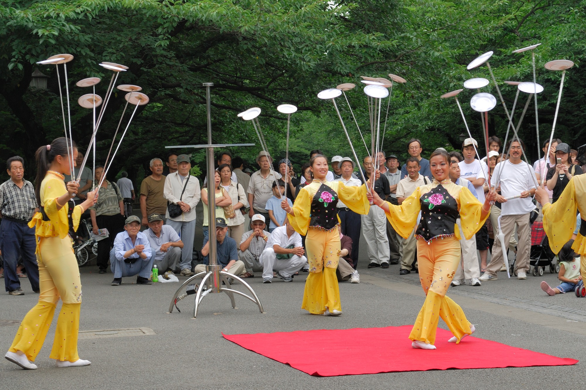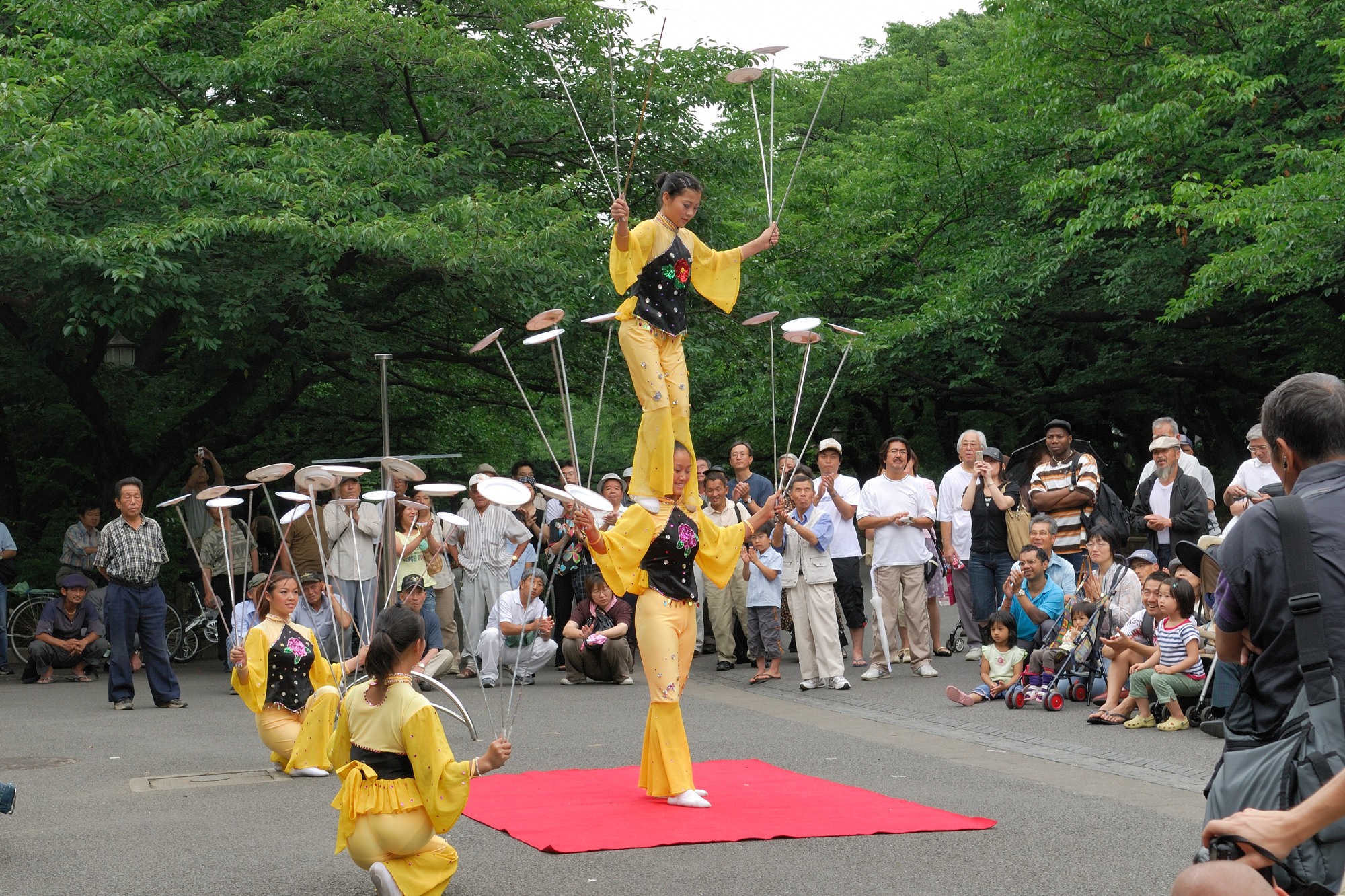 最初はただ回しているだけでしたが,そのうちに曲芸として,皿を回しながら逆立ちしたり,人の上に乗ってそこで逆立ちしたりしました。すごい,すごすぎる。大勢の観客とともに拍手喝采です。