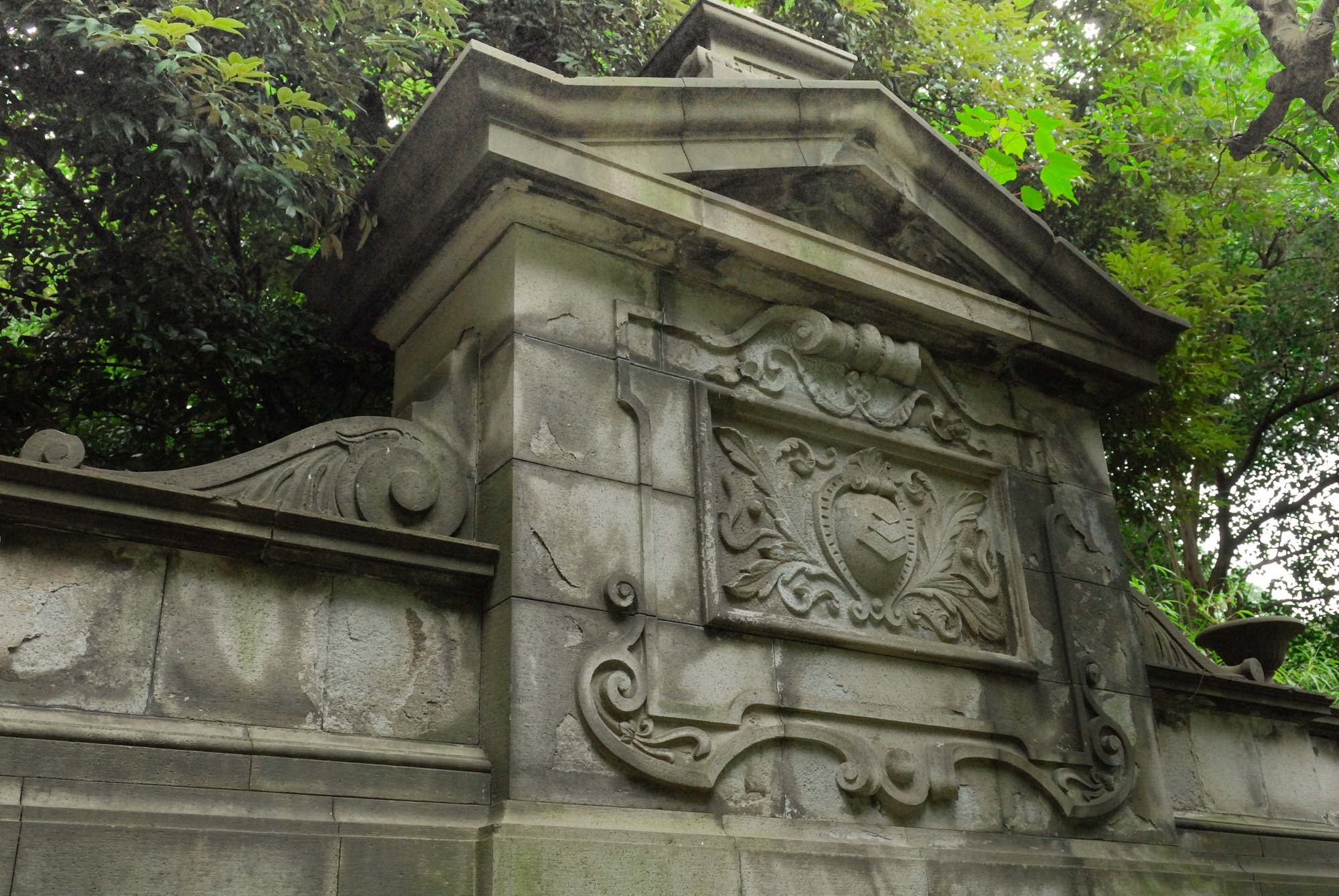 門から中に入り歩き出した所で,とうとう雨がぱらついてきました。傘は持っていません。しかしここまで来て帰るのも悔しいので,まずそのまま建物の中に入ってみることにしました。建物までは結構長い緩やかな坂道を歩きますが,そこには綺麗なアジサイの花が咲いていました。また,建物の手前には,三菱のマークの元になったとも言われる彫刻のある立派な塀もあります。