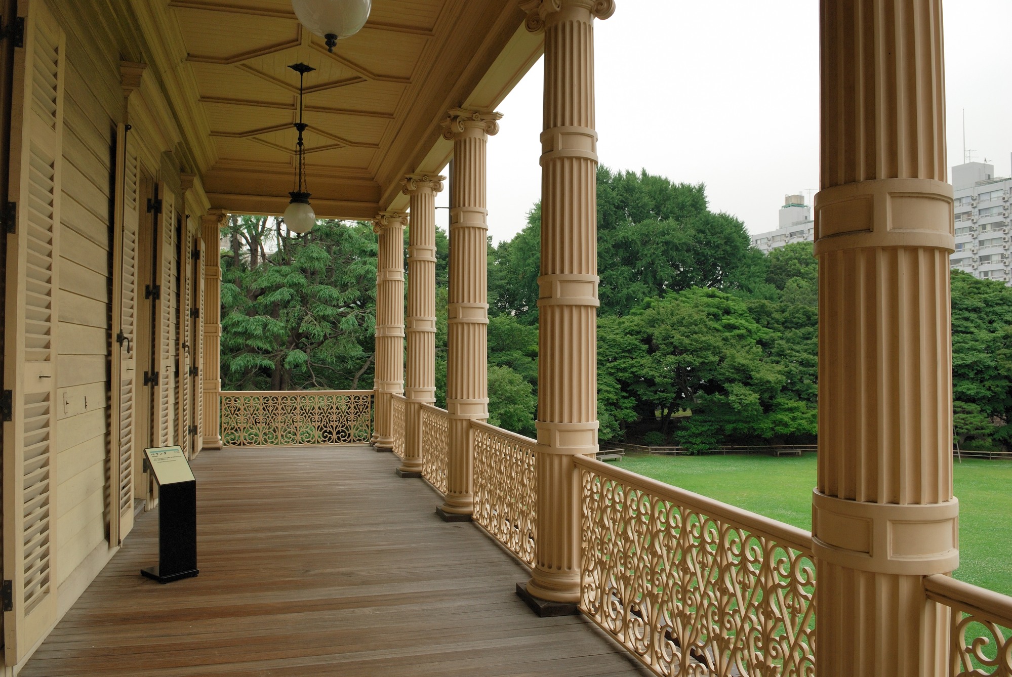 二階にはベランダがありますので,出てみました。このベランダの柱の形状もイオニア式の装飾だということで,歴史を感じさせるものです。ベランダからは広い芝生の庭を臨むことが出来ます。