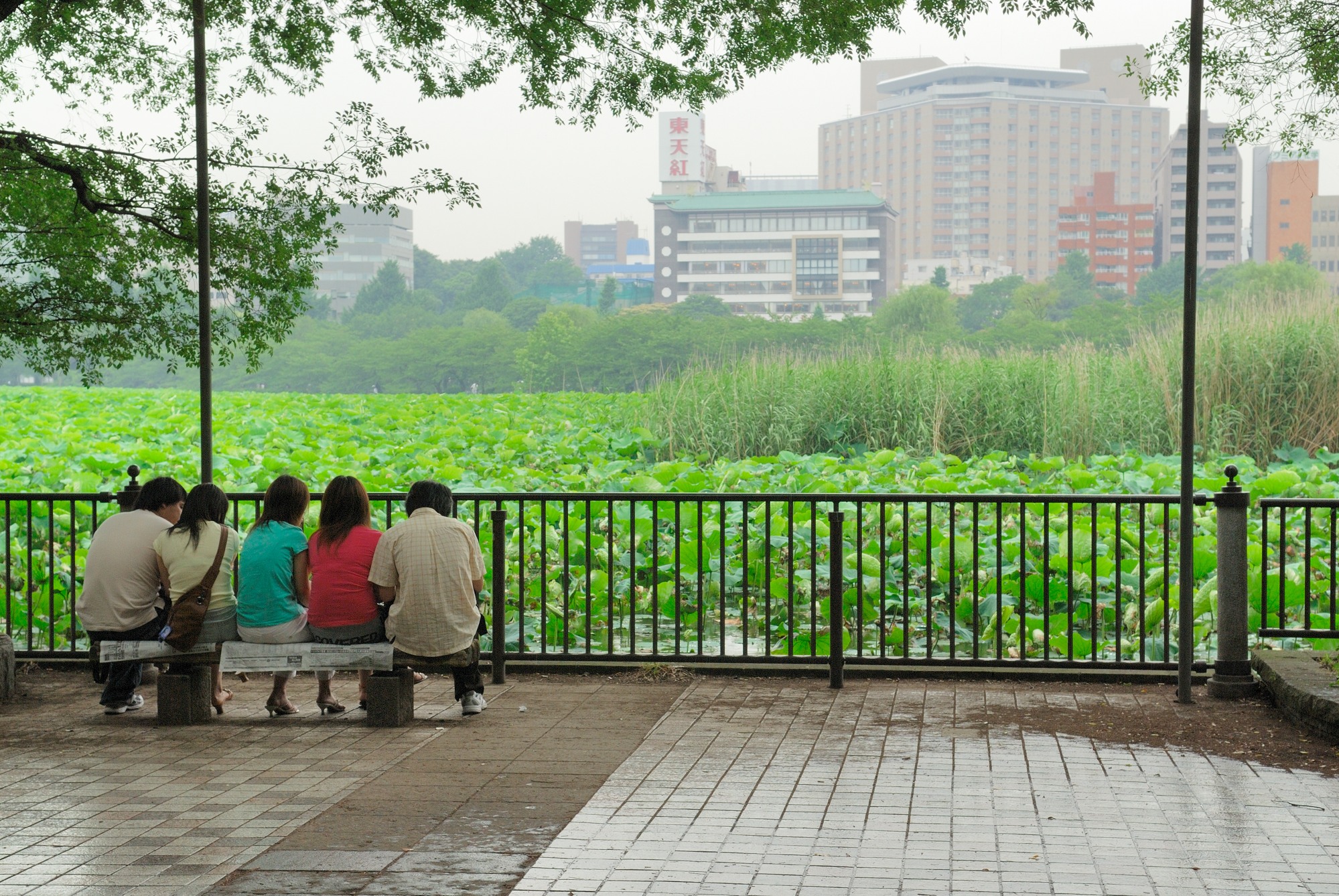 さてここで帰ることにしました。雨はパラパラ降ってきていますので,傘のない私は駆け足でまた不忍池の横を走り駐車場まで戻る羽目になりました。その時に不忍池を見たら,若者5人が仲良くベンチで雨宿りしていたので,思わず写真をパチリ,です。