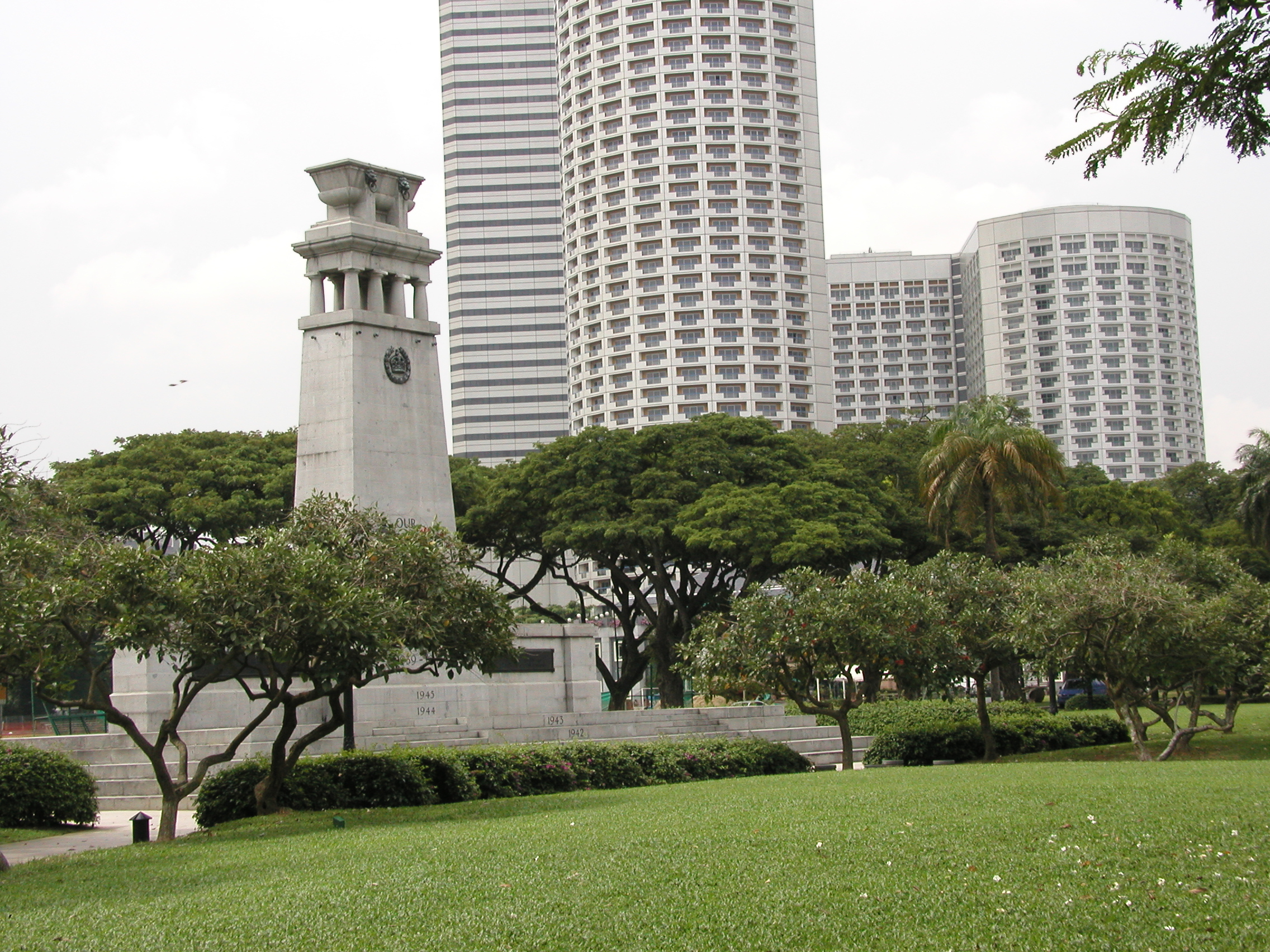 エリザベス・ウオークを奥に歩いて行くと、戦争時の記念塔らしきものが建っています。更にここからは緑の向こうに街並みが見えるし、また、花時計などもあったりしてなかなかいい公園でした。