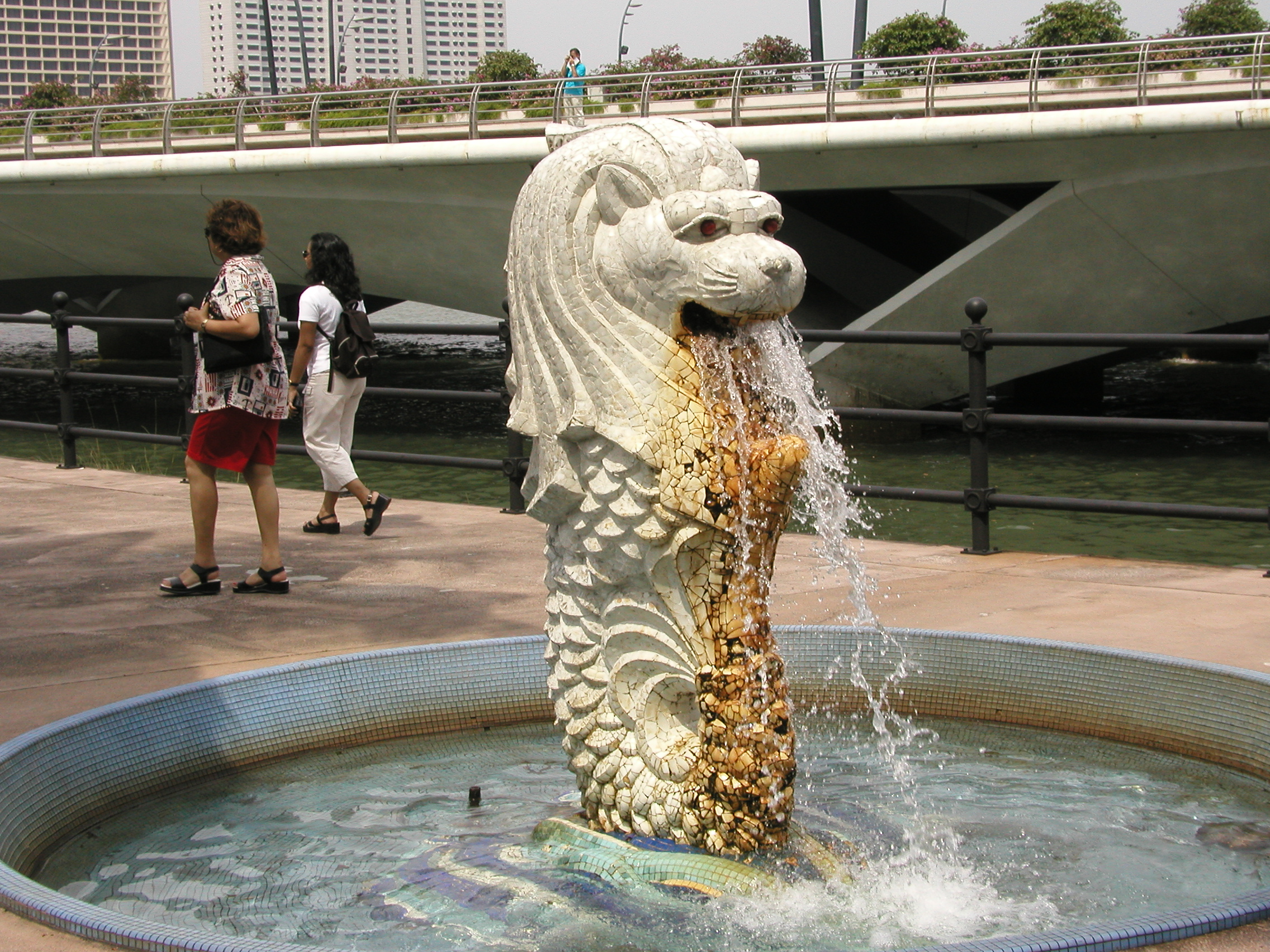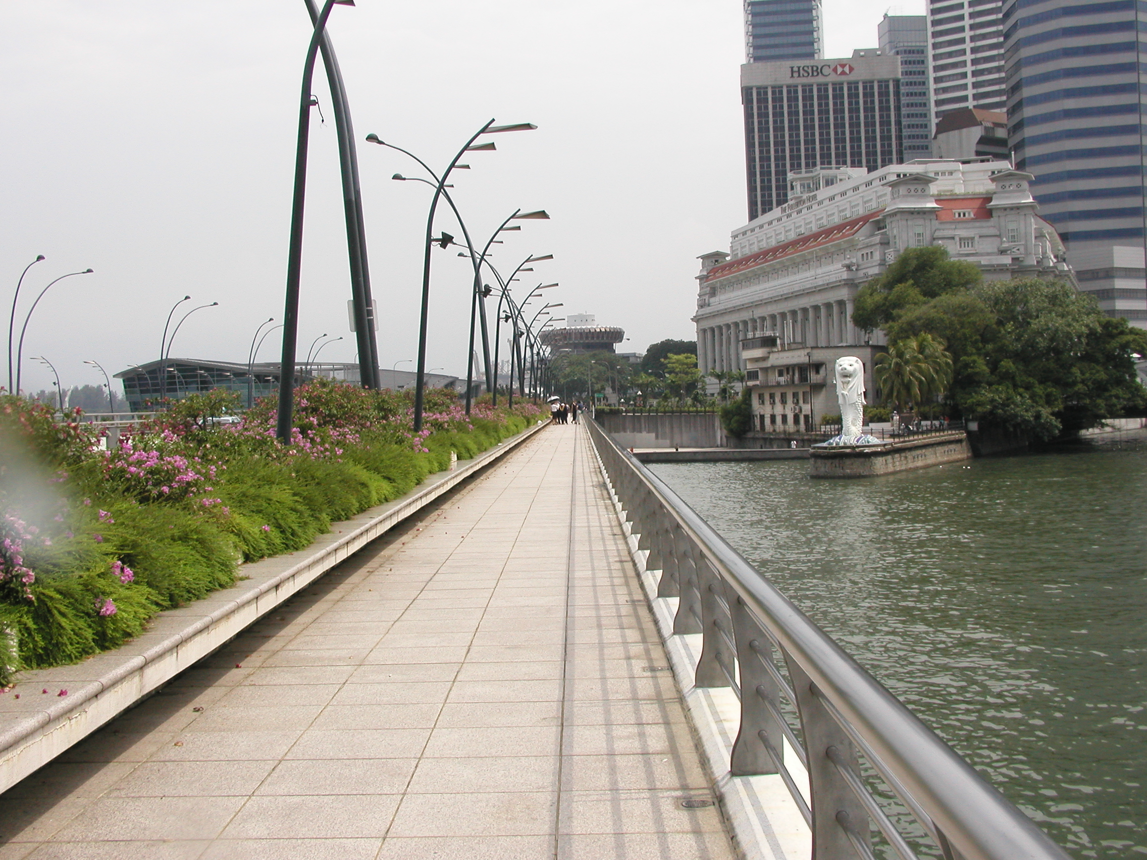 実は私たちは最初間違えてこの橋の左側を歩きました。しかしマーライオンは右側にあるので、橋を渡りきってから右側に渡り、再度戻って見ることになりました。この橋は必ず右側を歩いて下さい。もし間違えると途中に横断する場所がないので、渡りきってから戻るハメになります。そうするとただでさえ暑い所に輪を掛けて暑くなり、たまりませんので注意が必要です。