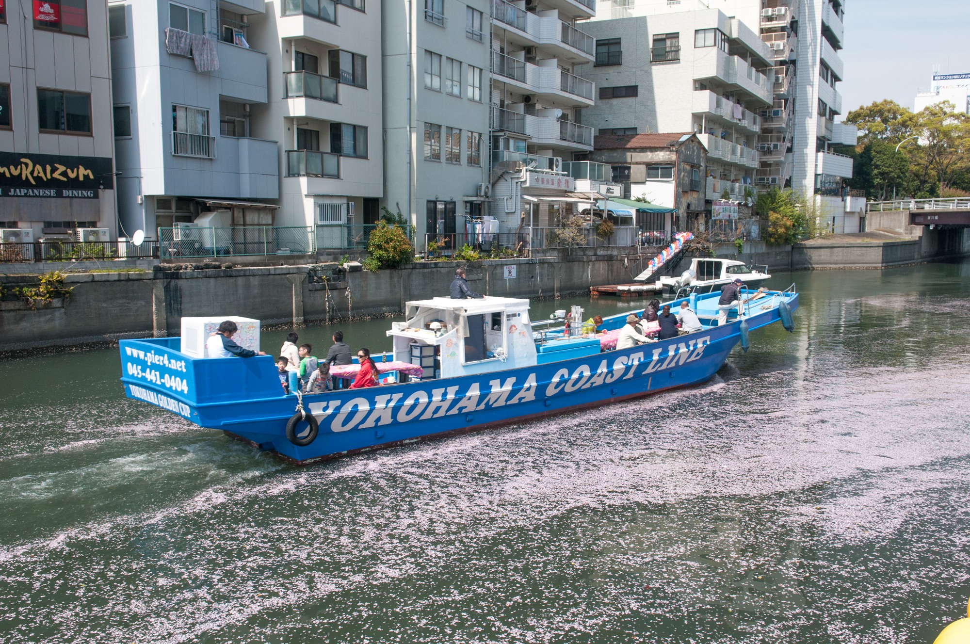 ここまで来ると川に沿った桜並木はなくなり、すぐに大通りを超える歩道橋を渡ります。眼の前はJR桜木町駅になります。更に進むともう大岡川の河口になり、そこには船着き場がありました。先程見た屋形船や観光船はここから発着しているようです。
