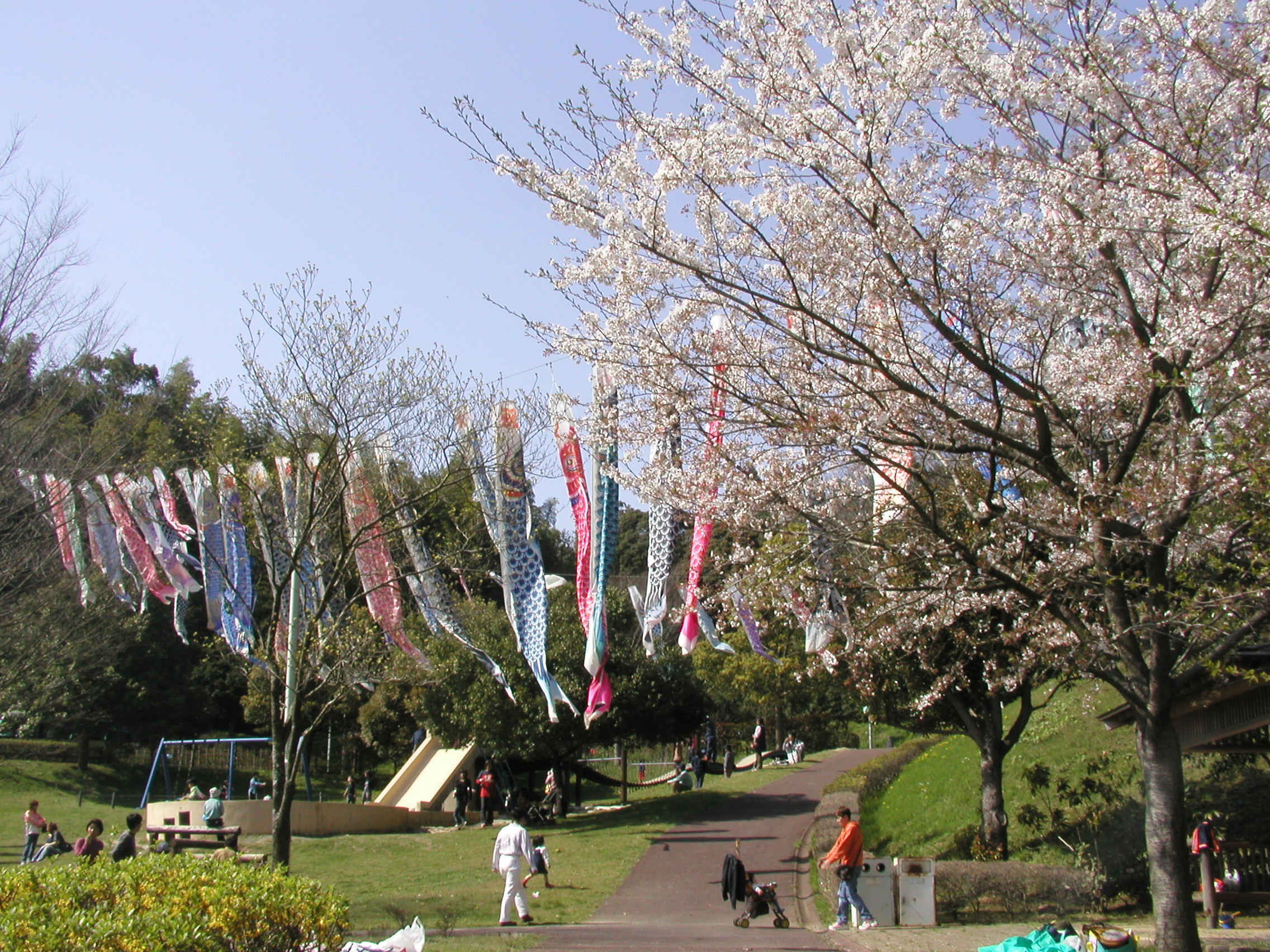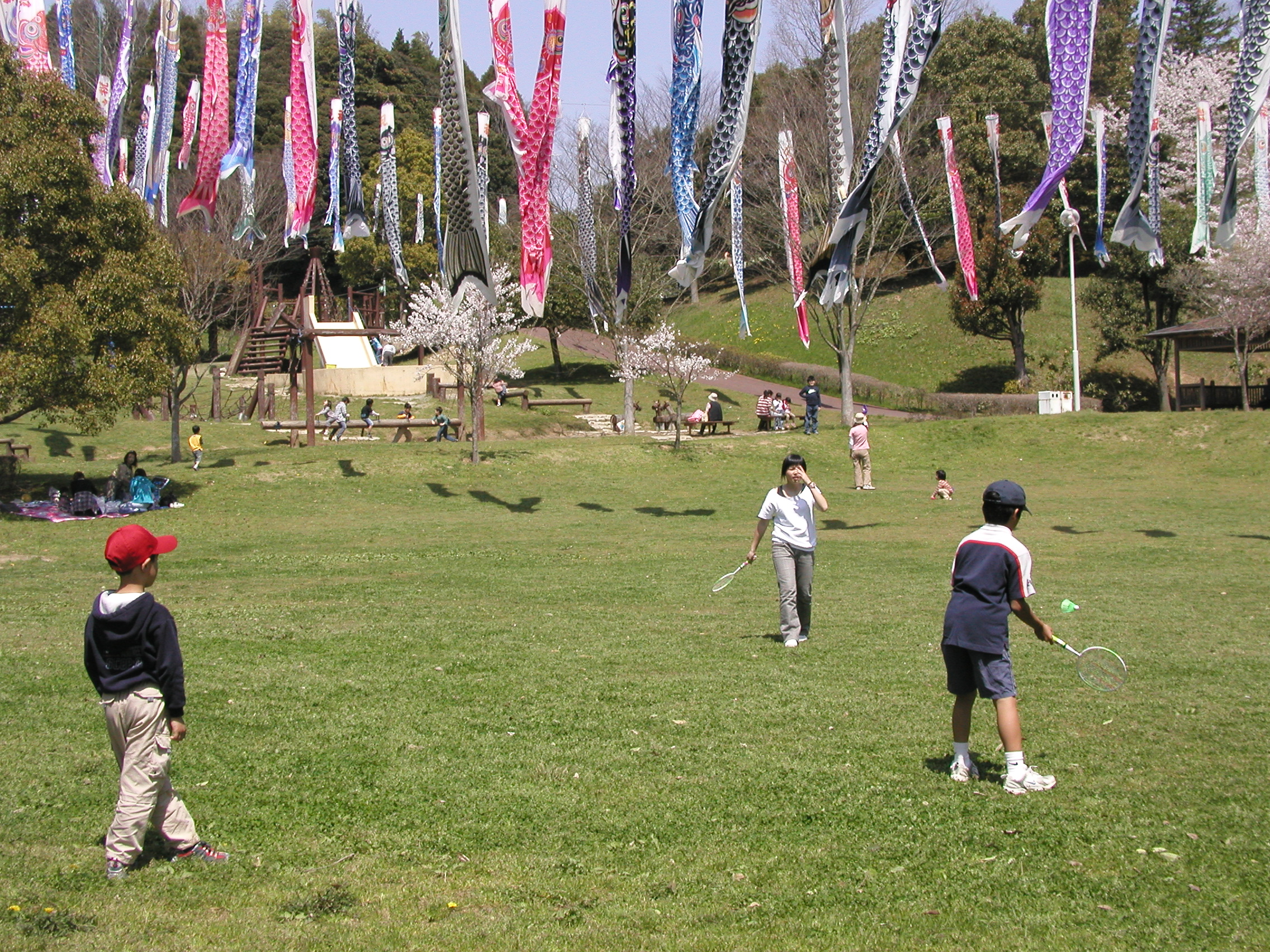 行ってみるとちょうどうまい具合に「芝山さくら祭り」をやっていて,公園内は桜満開でとても綺麗でした。しかも子供の日が近いせいか、多くの大きな鯉のぼりも飾ってあり、子供たちは大喜び。ここで近くにシートを敷いて皆でお弁当を食べます。その後は子供たちはボール遊び、大人たちはビールを飲んだために皆で暖かな陽気のもと、しばしお昼寝をしました。