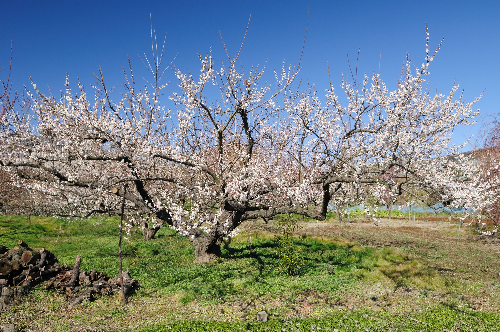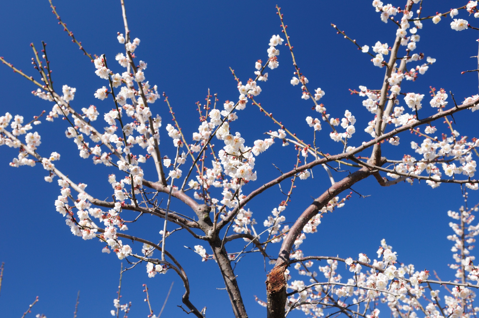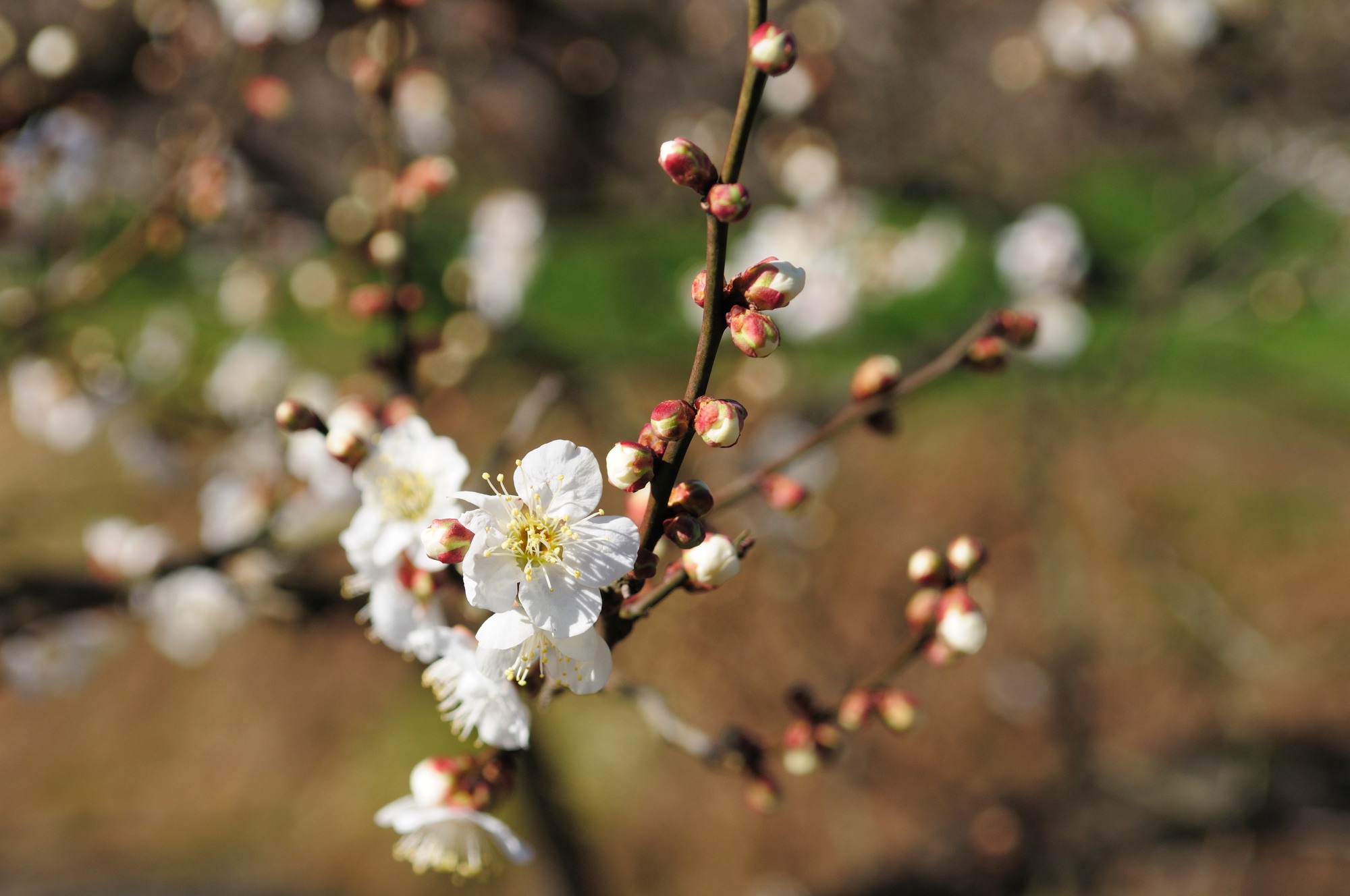 さて梅林の方へ歩いていきます。梅林というだけあって,通路の両側に実の多くの梅が咲き乱れており,非常に綺麗でした。このあたりは暖かいのでしょうか,2月初旬というのにほぼ満開です。快晴の青空に映える梅の花も綺麗,近くで見るともと綺麗,感動しながら歩いてゆきます。ここは白い梅が中心ですが紅梅もあります