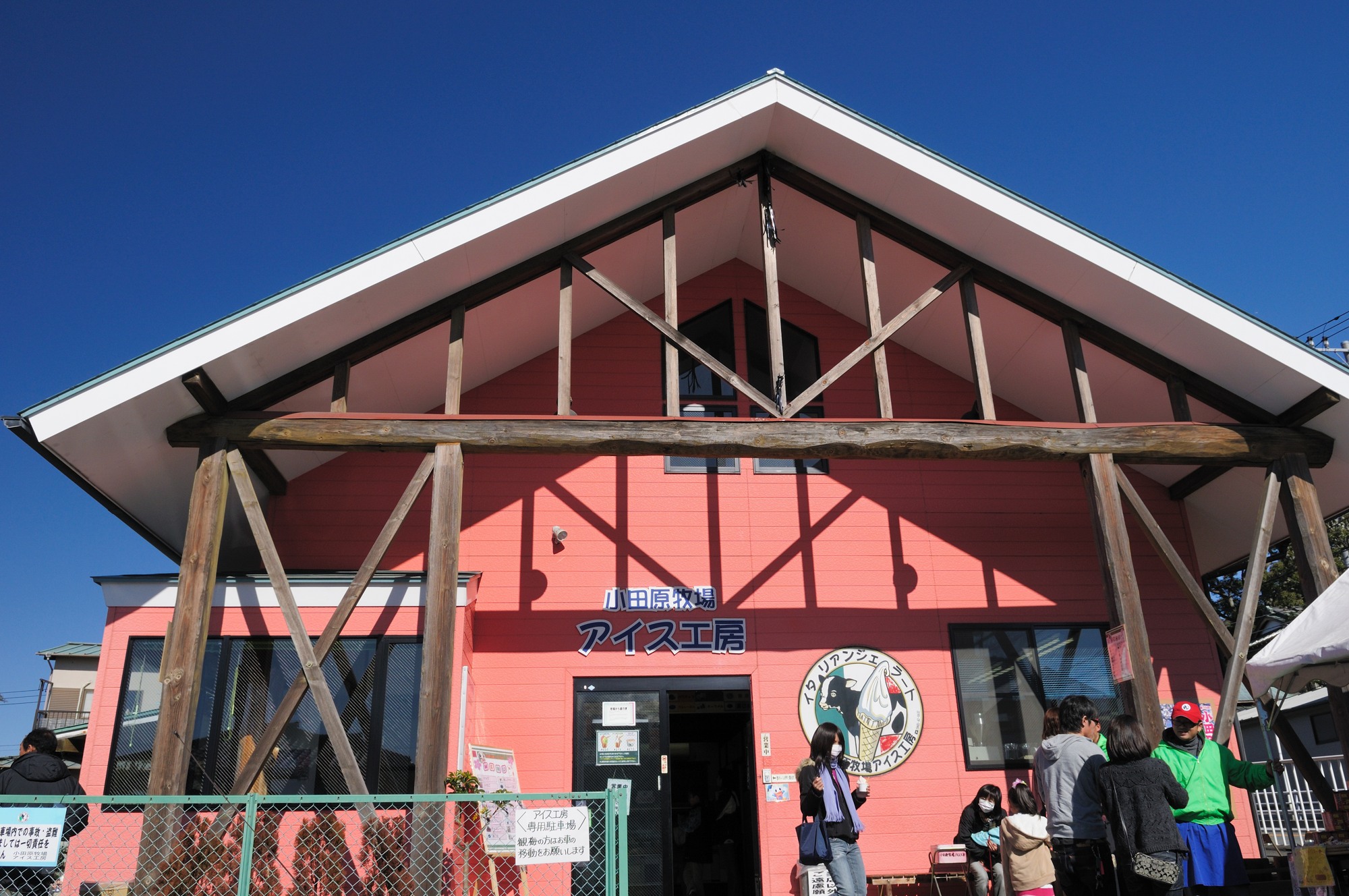 車を止めた駐車場の隣には小田原牧場アイス工房があります。寒いですがここで食べたアイスはとてもおいしかったのでお勧めです。ここの駐車場からは,遠くに富士山がはっきり見えました。この時期,まだ雪をかぶっており,とても美しく見えました。